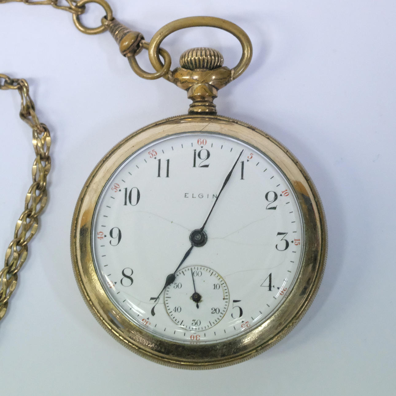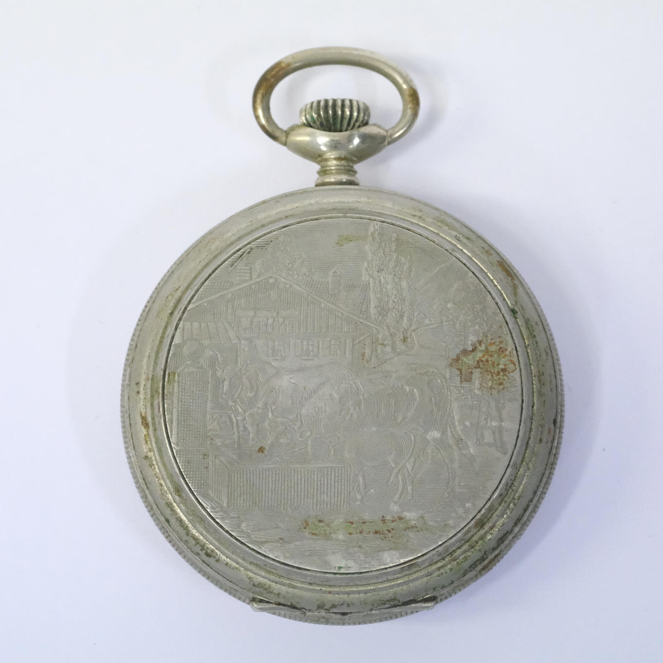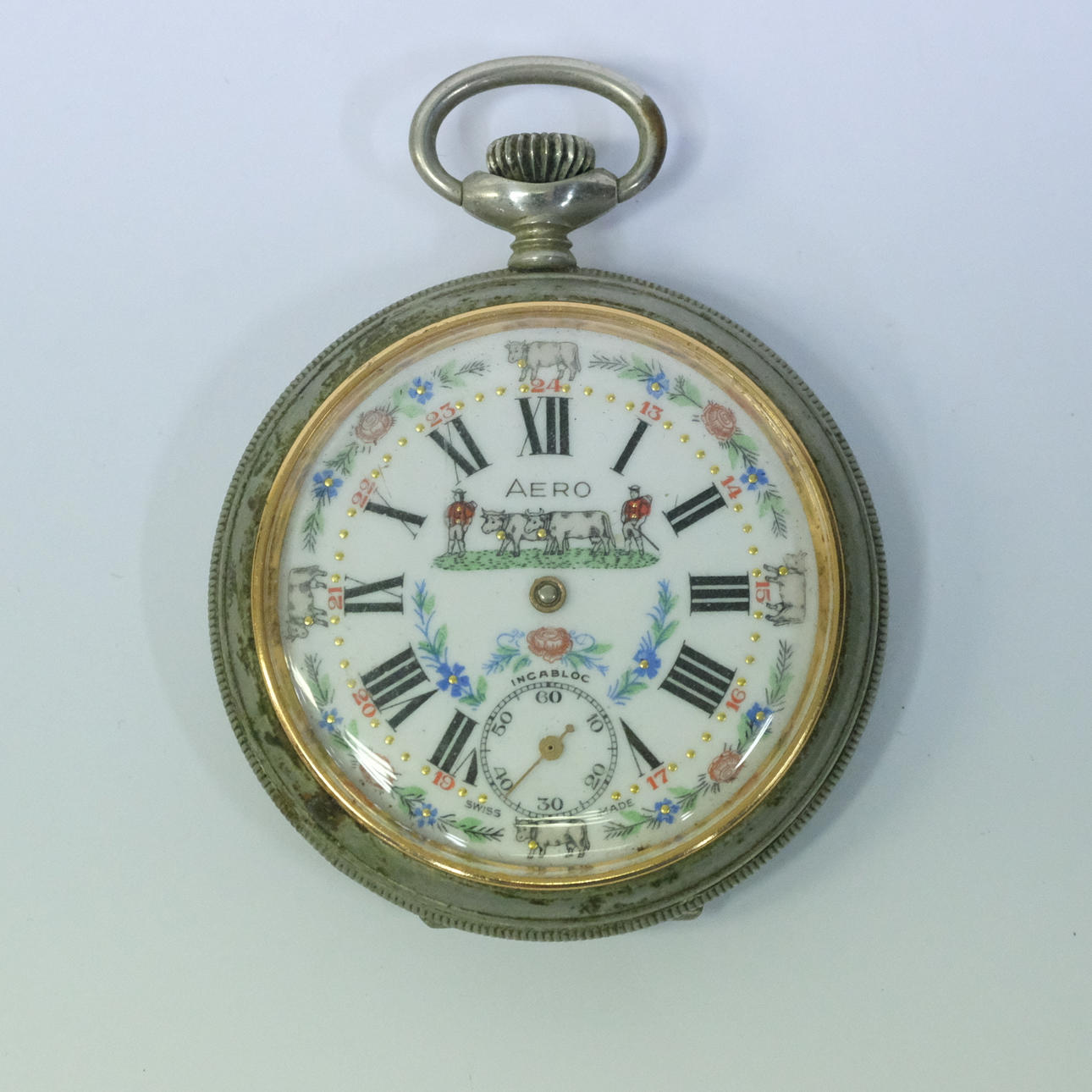 Pocket watch, Elgin, gold plated, screw case. Case number 781189. Workshop number 14243206. Diameter 5.5cm. Watch chain, length 27cm. Pocket watch, Aero, white metal, dial with decor of animals, flowers and figurines. Back case decoration of bull, figure and house. Diameter 5cm. Condition Injuries. 37588