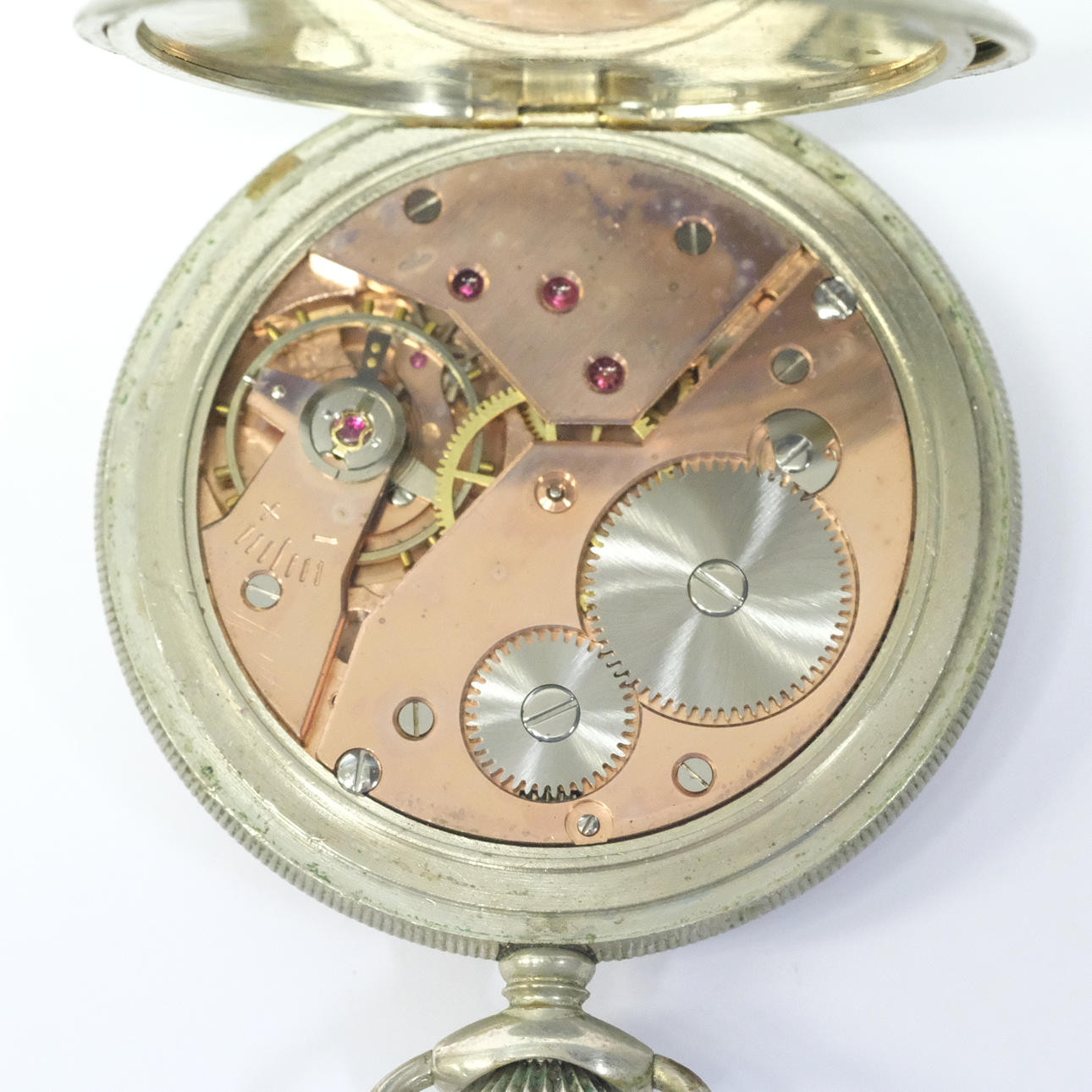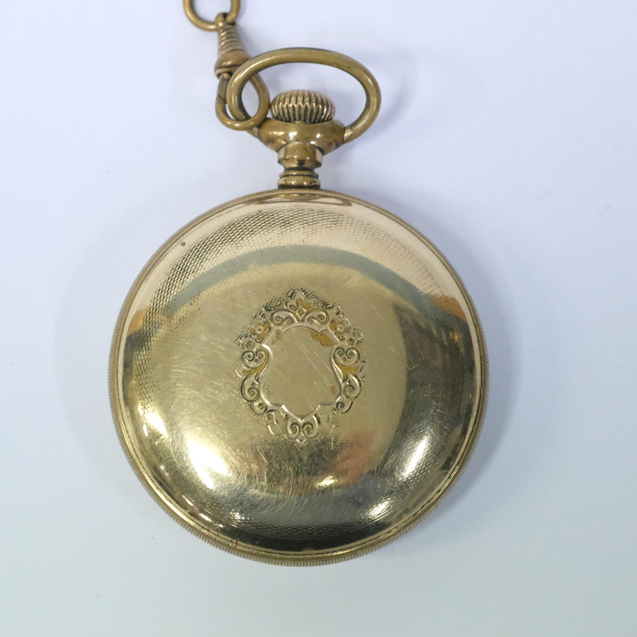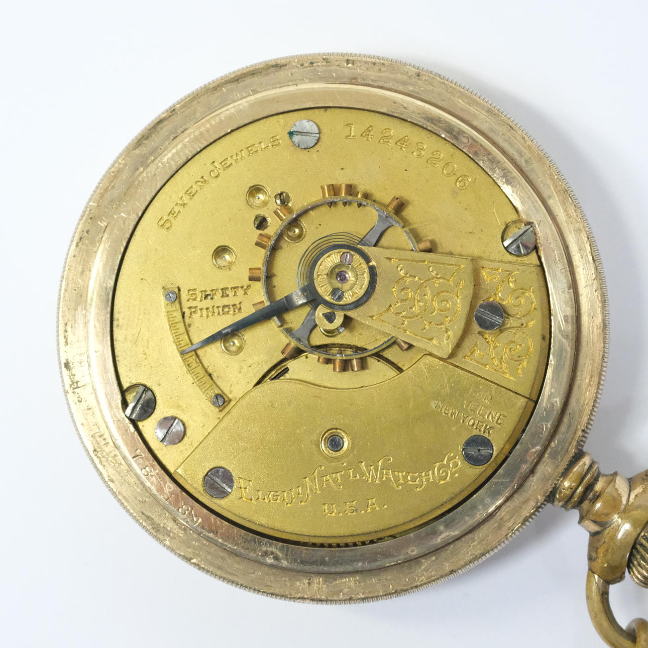 Pocket watch, Elgin, gold plated, screw case. Case number 781189. Workshop number 14243206. Diameter 5.5cm. Watch chain, length 27cm. Pocket watch, Aero, white metal, dial with decor of animals, flowers and figurines. Back case decoration of bull, figure and house. Diameter 5cm. Condition Injuries. 37588