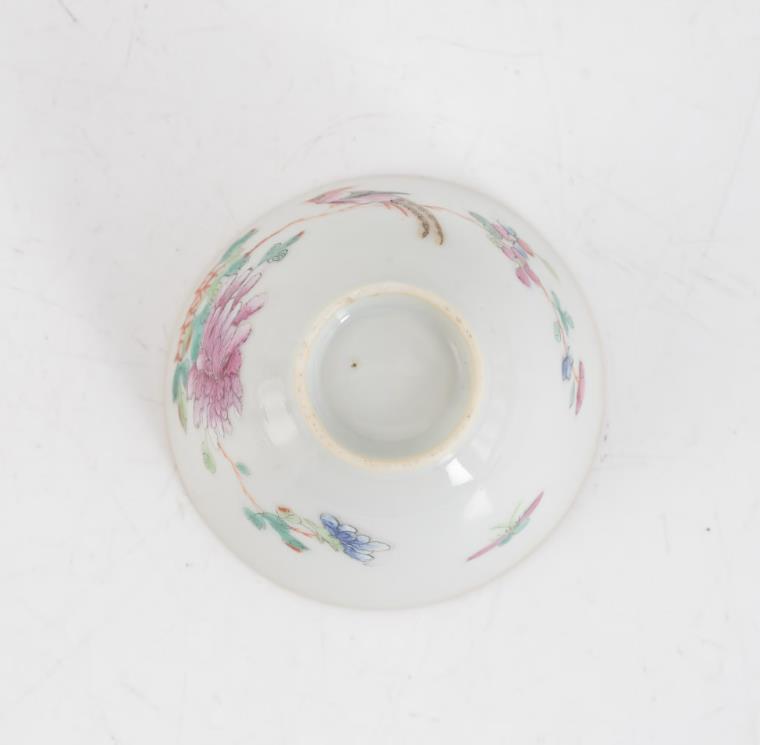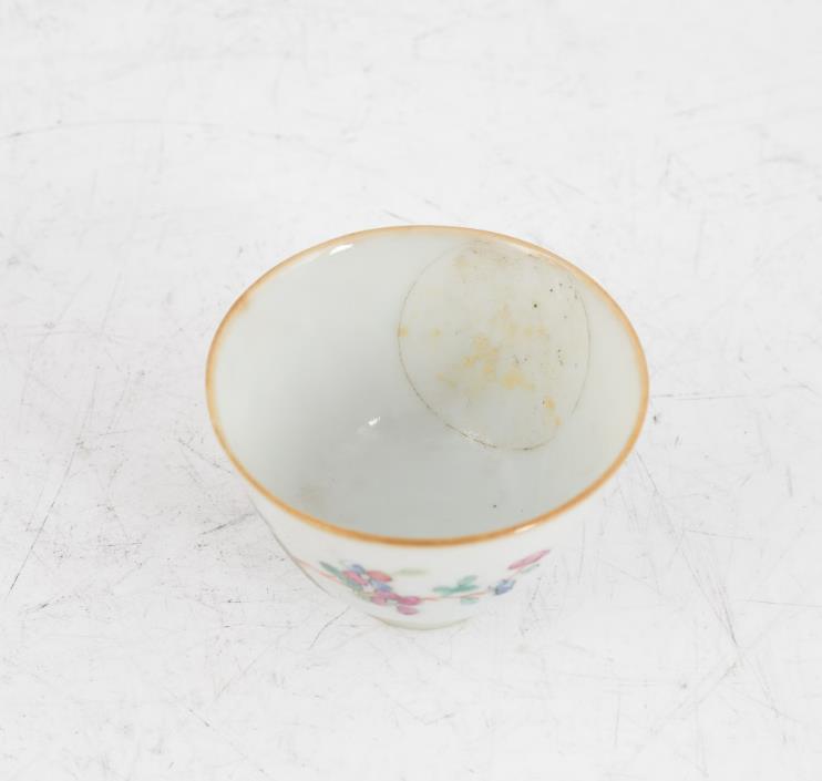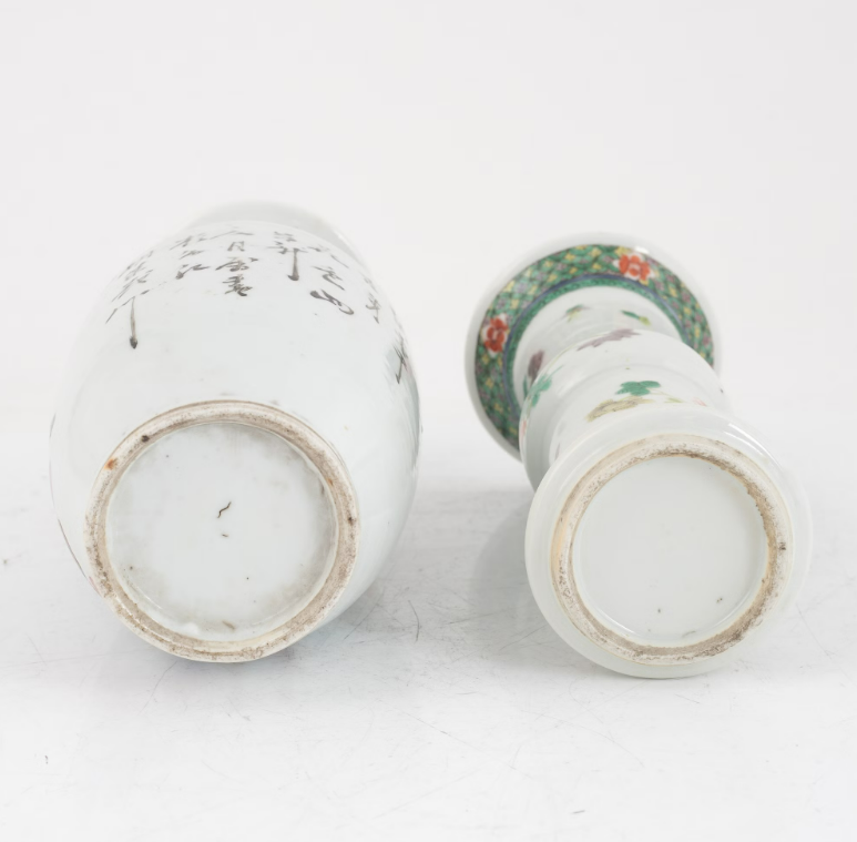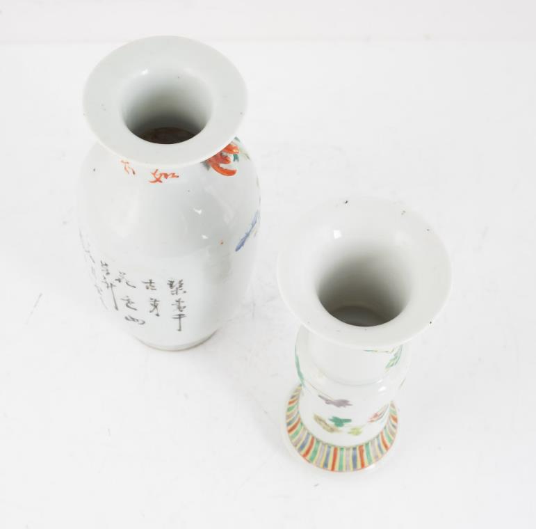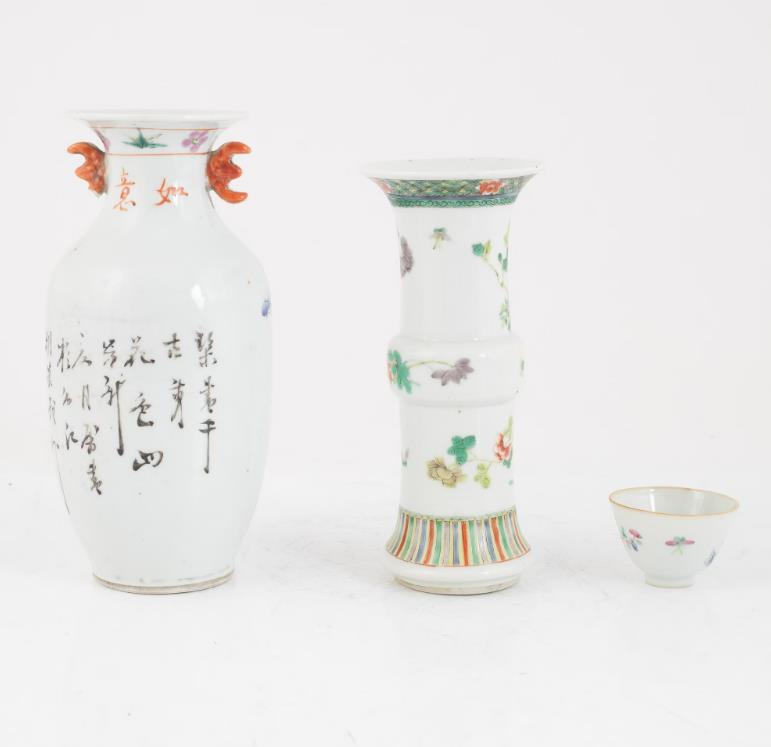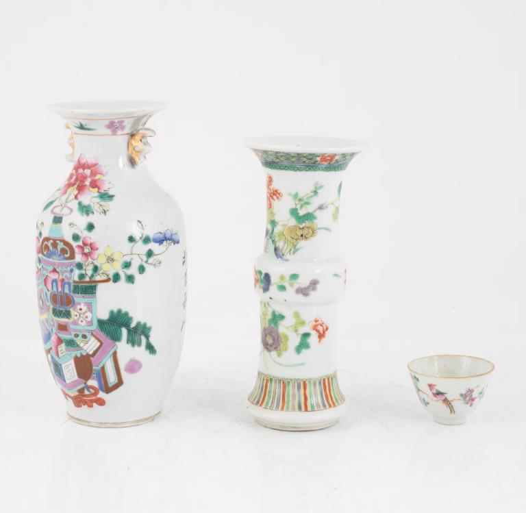 Balusterformaf vase, decorated in Famille Rose with motifs of antiques and flowers, height 22.5 cm. Vase with flared mouth decorated in FAmille Verte with motif of flowers, height 20 cm. Cup decorated in Famille Rose with motif of bird on flowering tree branch, diameter 6 cm. Wear and tear in places. Burn crack. The baluster-shaped vase with a small muzzle crack. The cup with foot ring chips. Spots. Glaze mist.
