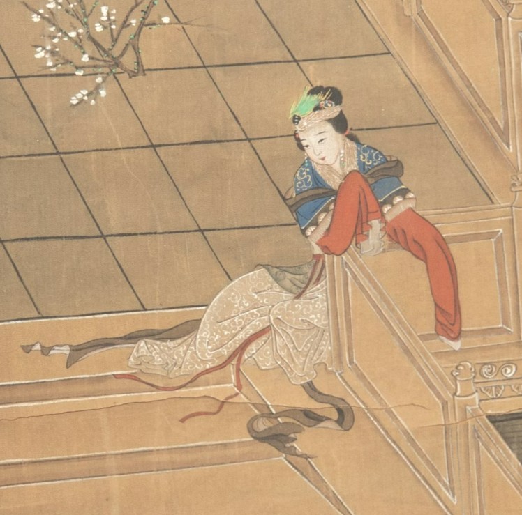 Decor of elegant ladies in palace and garden setting, signed, approx. 81x20.5 cm Tears. Not examined out of frame.