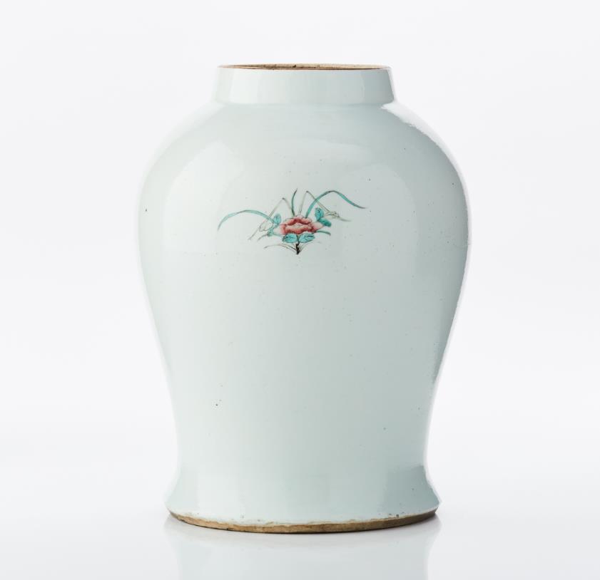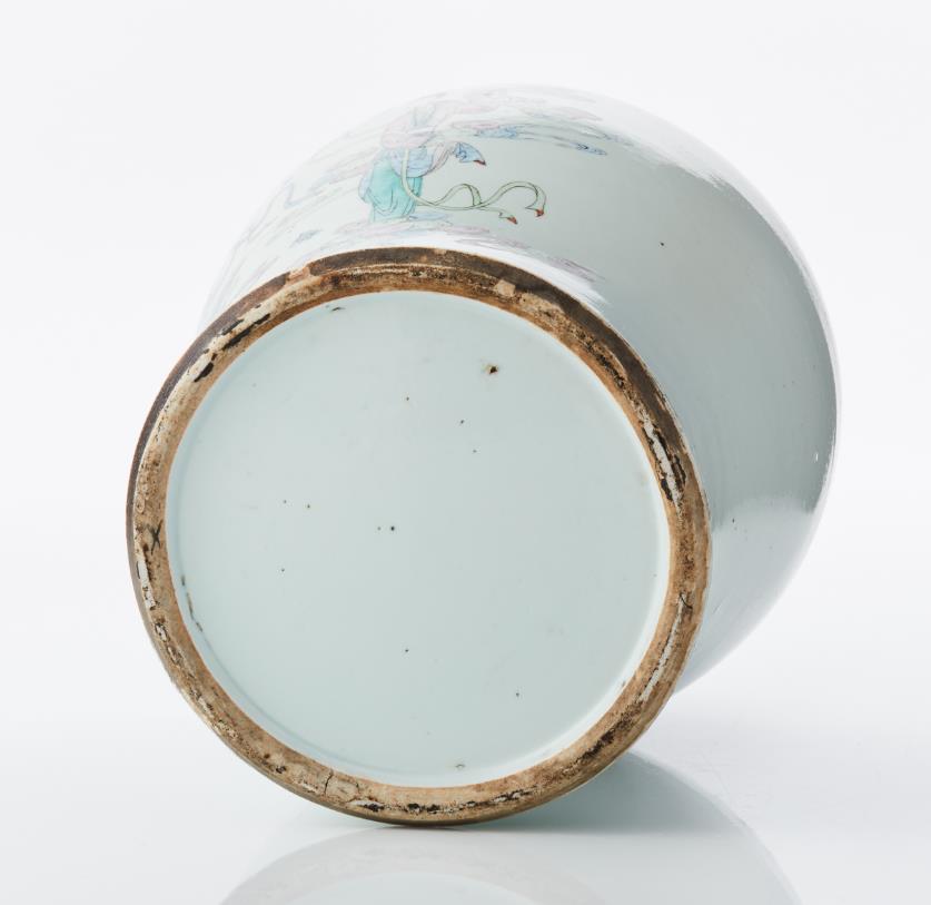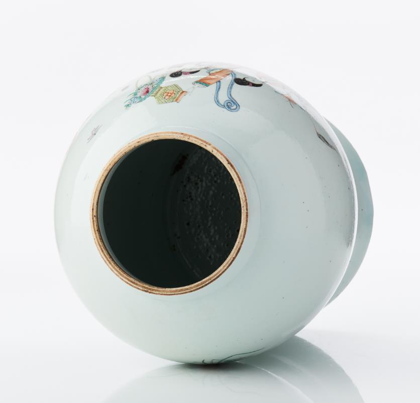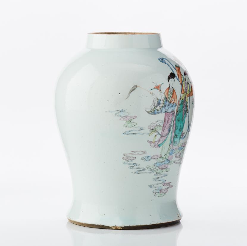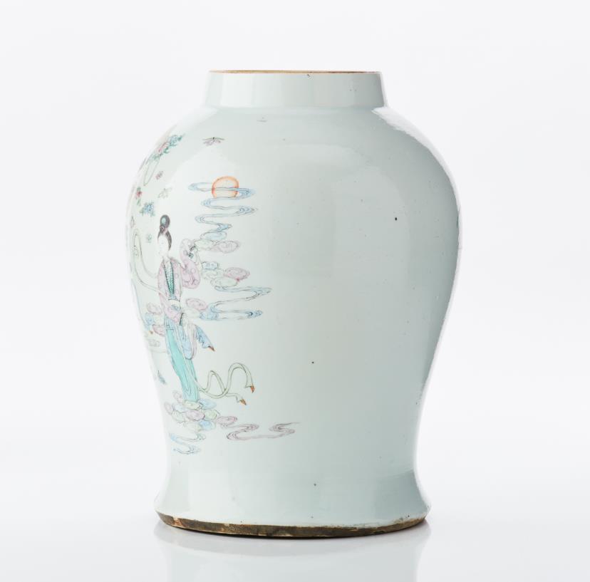 Decoration of elegant ladies among clouds in the moonlight in famille rose. H 34.5 cm. Condition report Wear. Minor glaze defects. Lacks a lid.