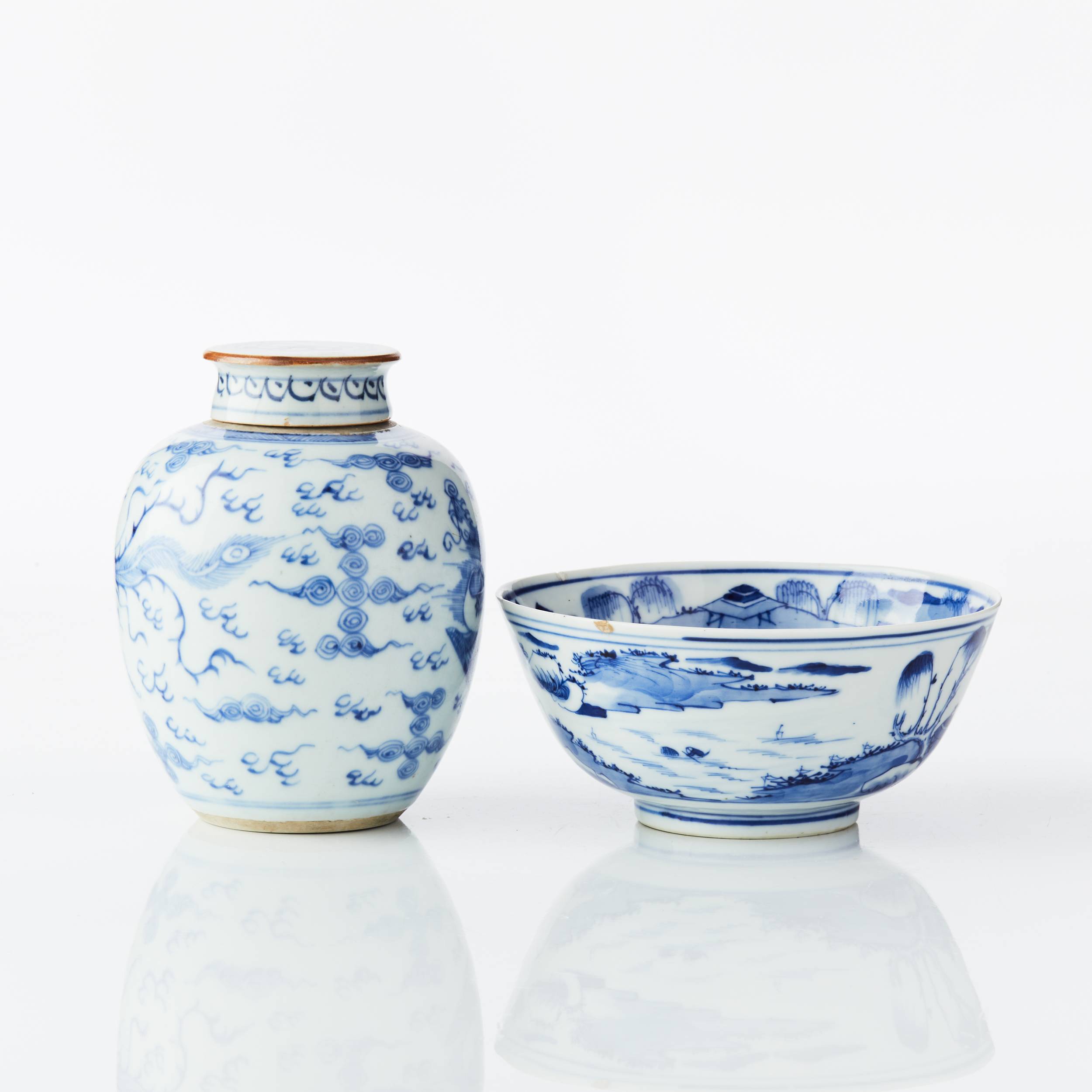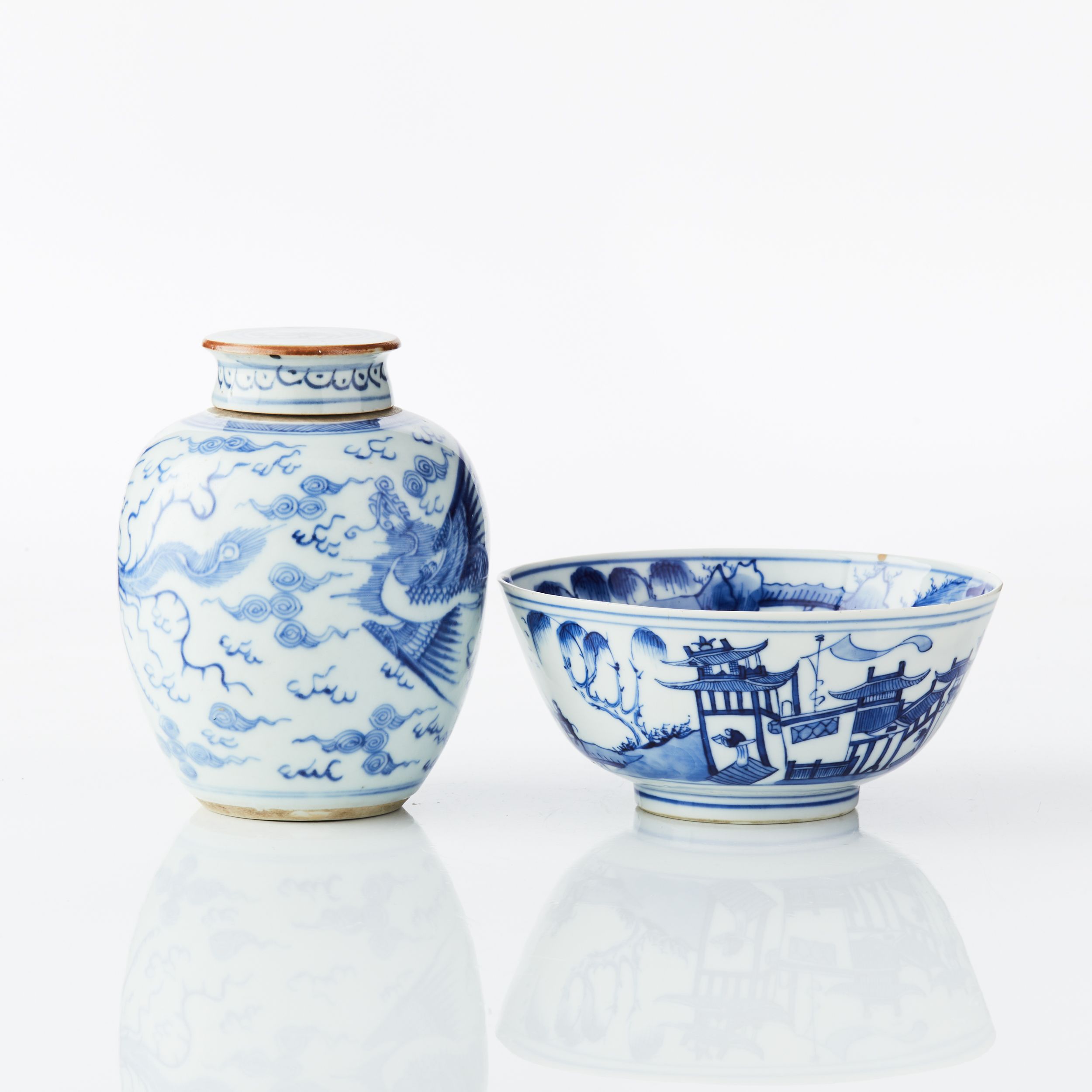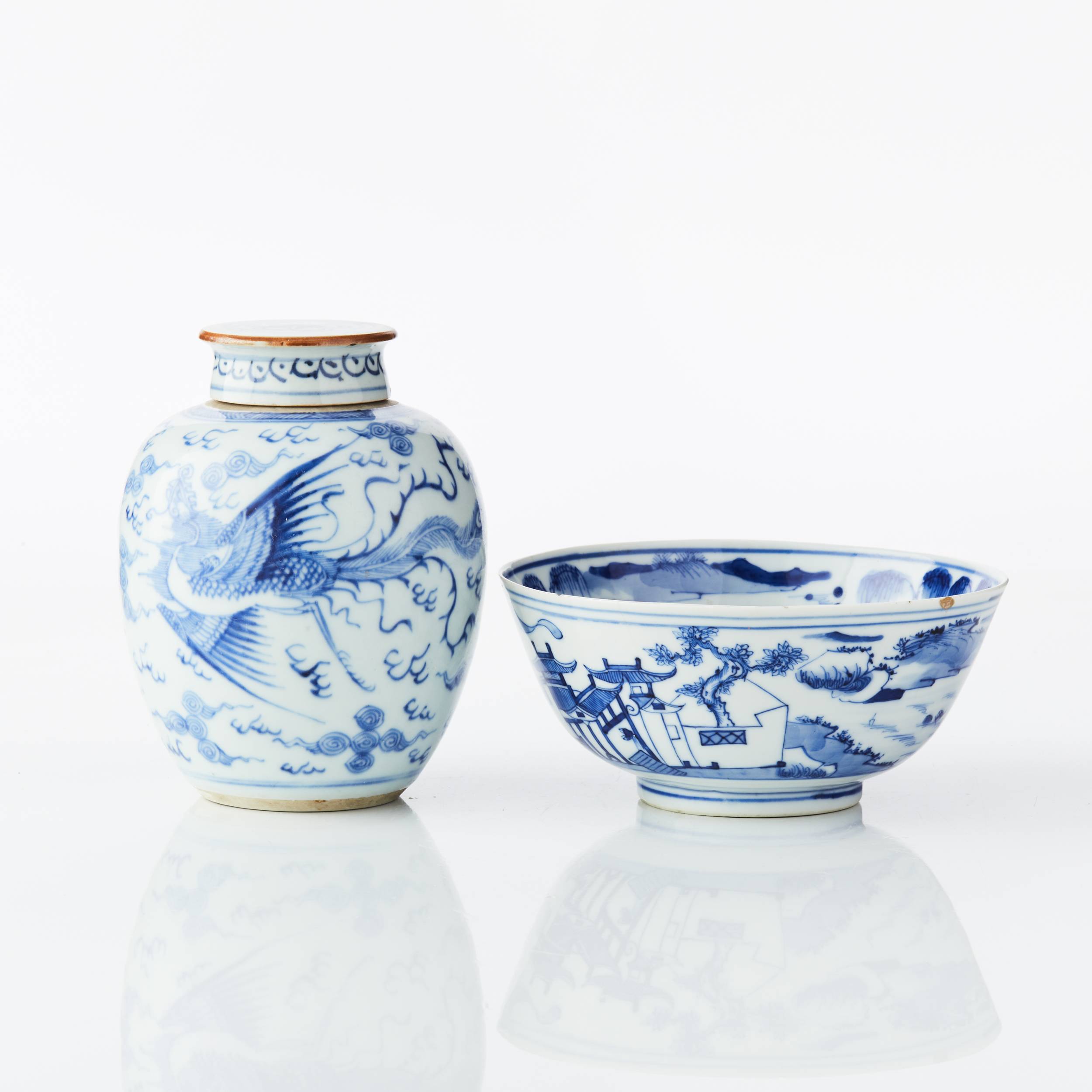 Decoration of phoenix birds among clouds and river landscapes in blue-and-white underglaze. Bowl with four-character mark of Kangxi, so-called "Kangxi revival". H 6.7 & 13.5 cm. Provenance Johanne Huitfeldt (1932–2023). Condition report Wear. The jar with a crack to the base. Possibly replaced cover. The bowl with cracks and chips.