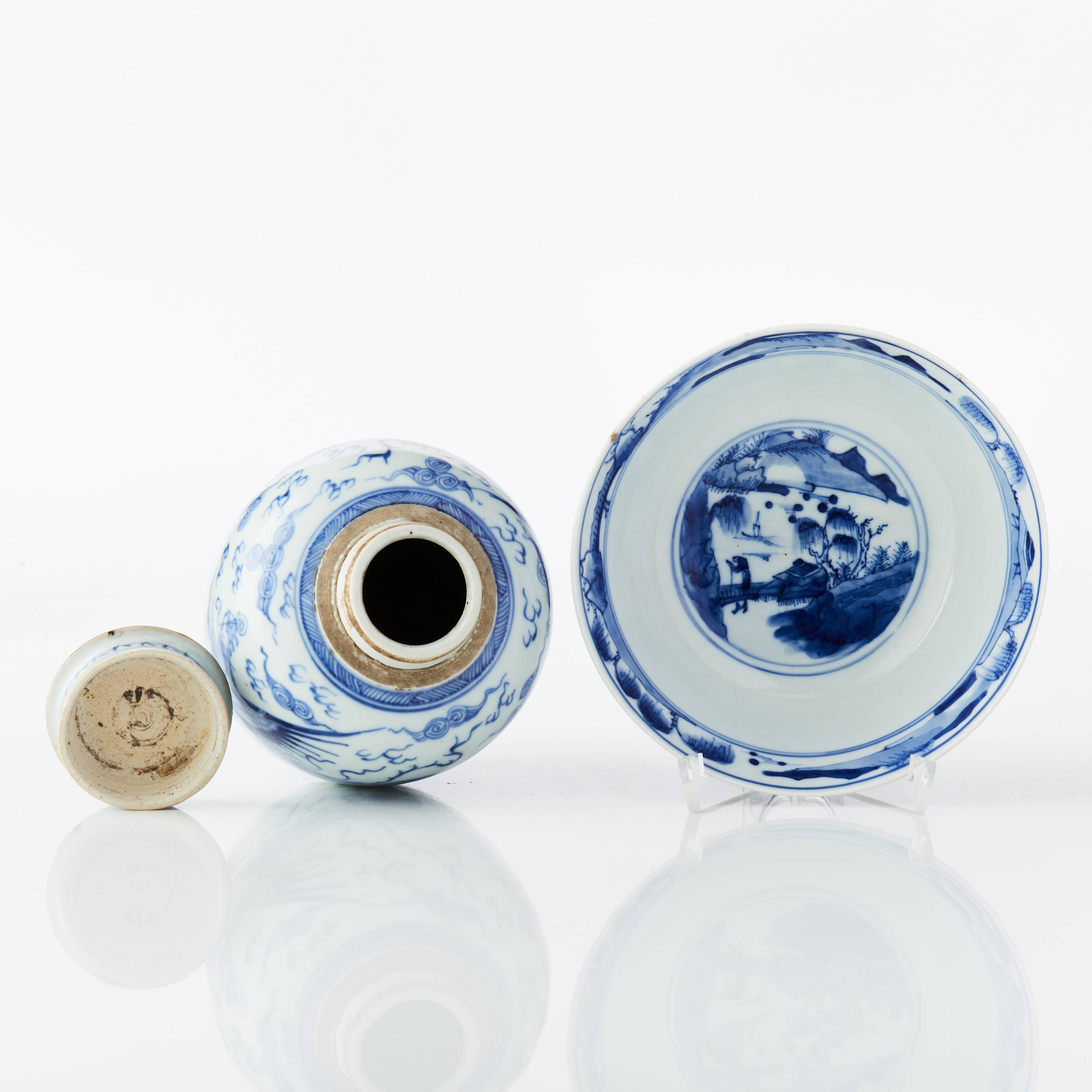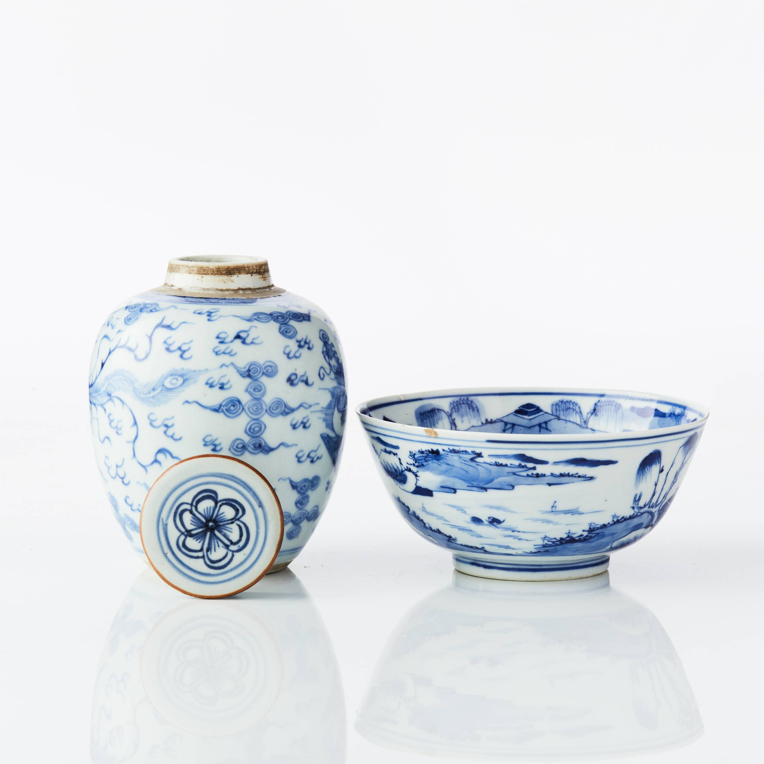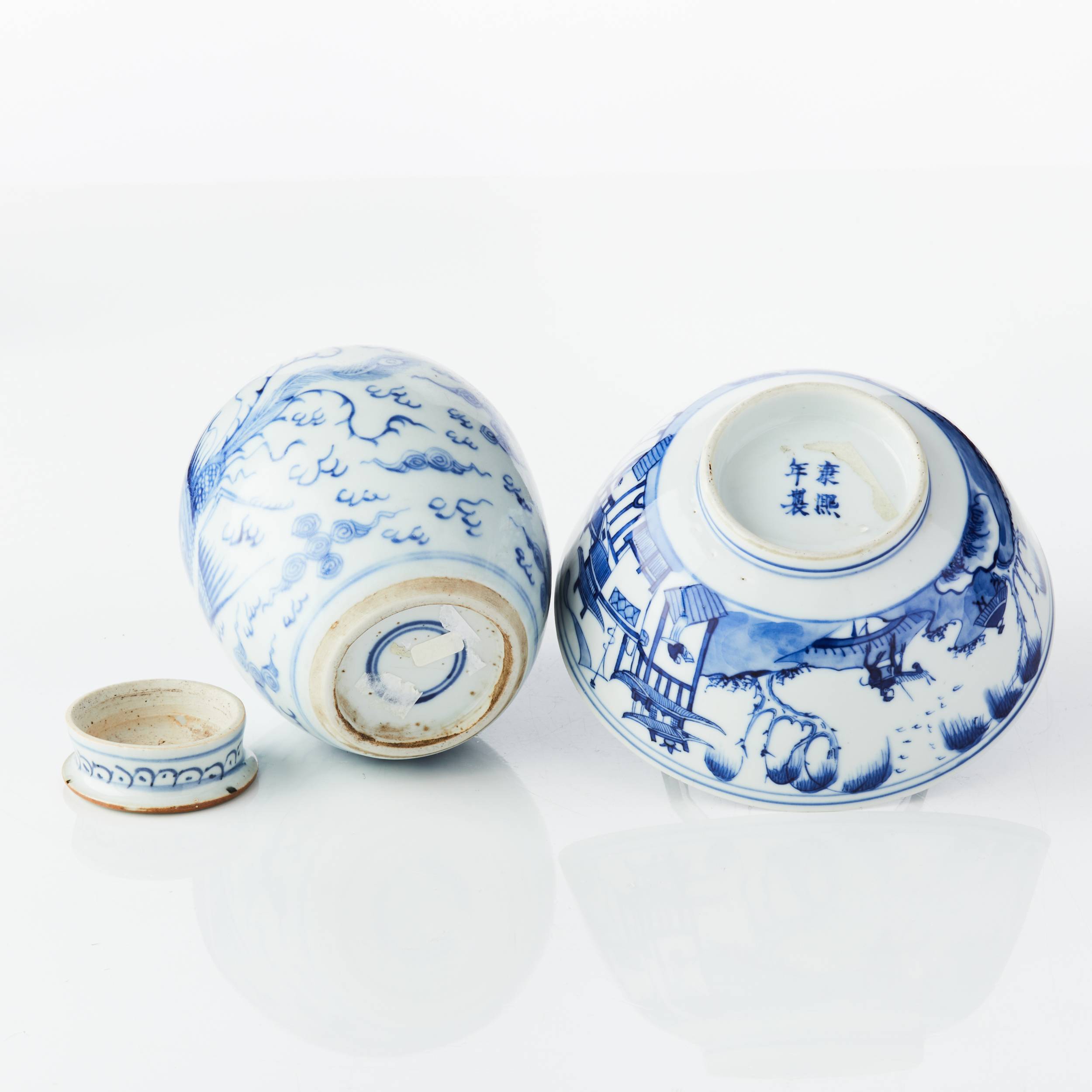 Decoration of phoenix birds among clouds and river landscapes in blue-and-white underglaze. Bowl with four-character mark of Kangxi, so-called "Kangxi revival". H 6.7 & 13.5 cm. Provenance Johanne Huitfeldt (1932–2023). Condition report Wear. The jar with a crack to the base. Possibly replaced cover. The bowl with cracks and chips.