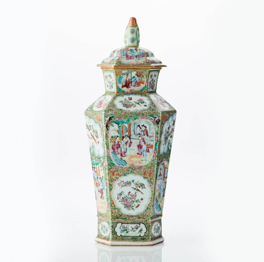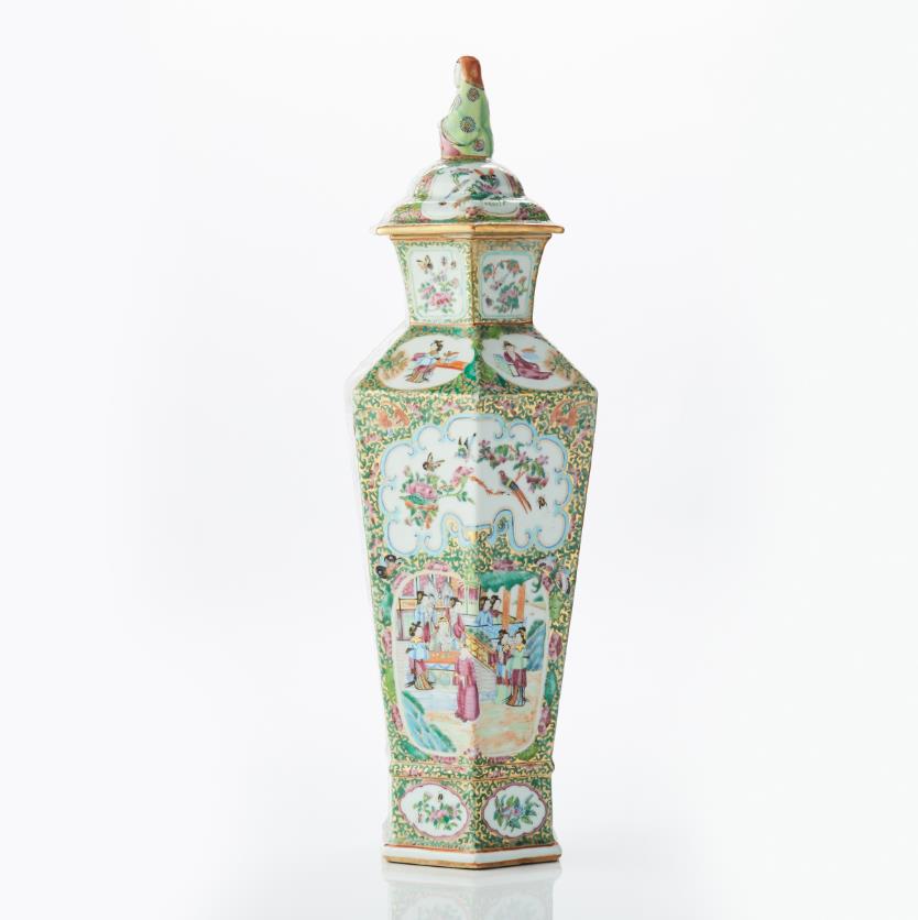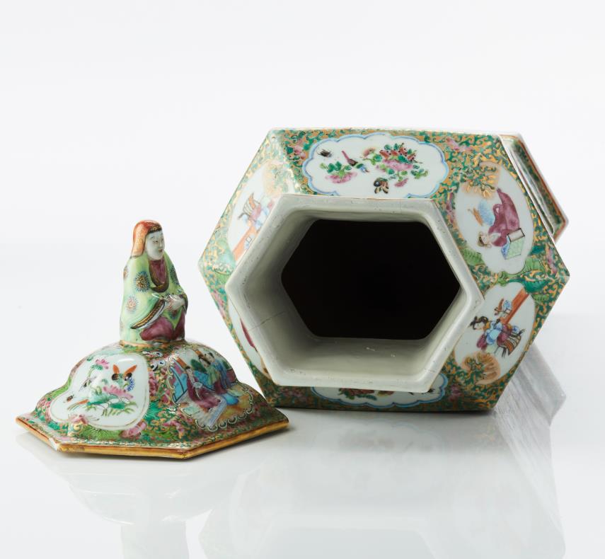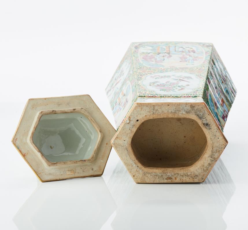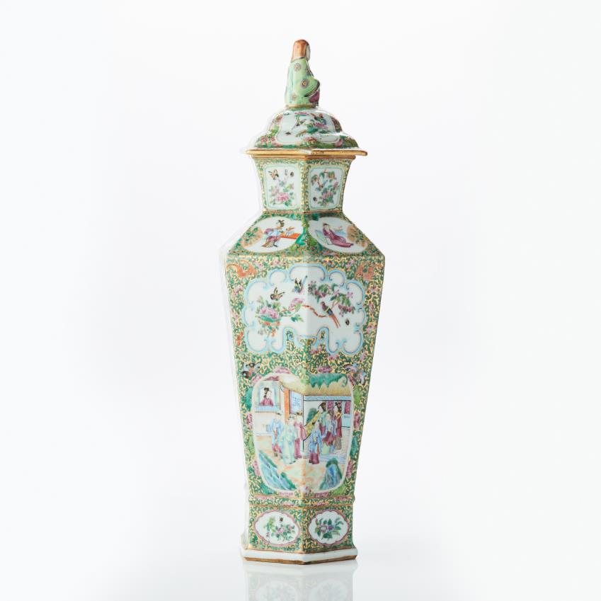 Hexagonal shape. Decoration of vignettes with figure scenes and flowers as well as insects and birds in famille rose, so-called "rose mandarin". Lid knob in the form of a crouching figure. H 63 cm. Condition report Wear. Repaired neck. Notch.