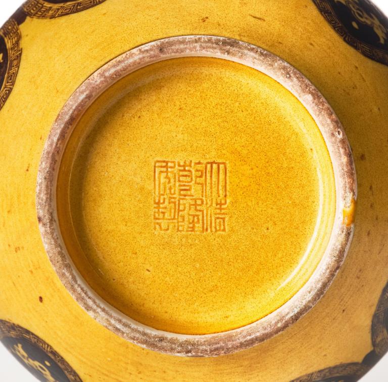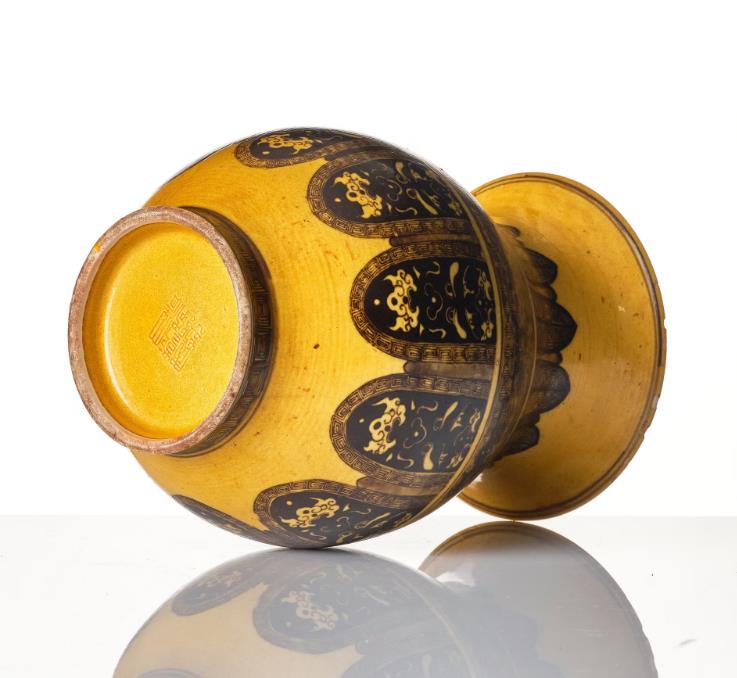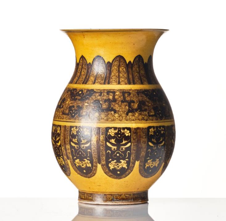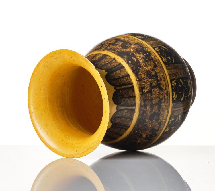 After a bronze model, yellow with archaic decoration in brownish-black against a yellow background. Height 27 cm. A chip at the mouth. Provenance Property of a Swedish lady who worked for foreign ministry.