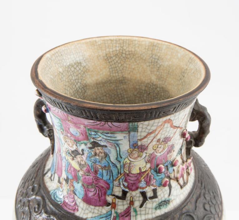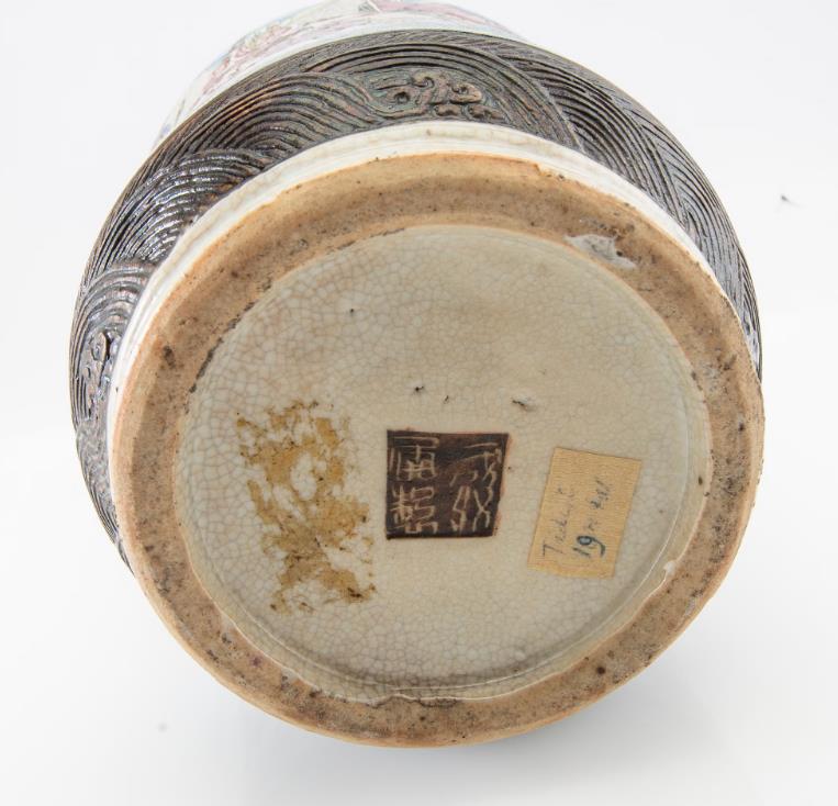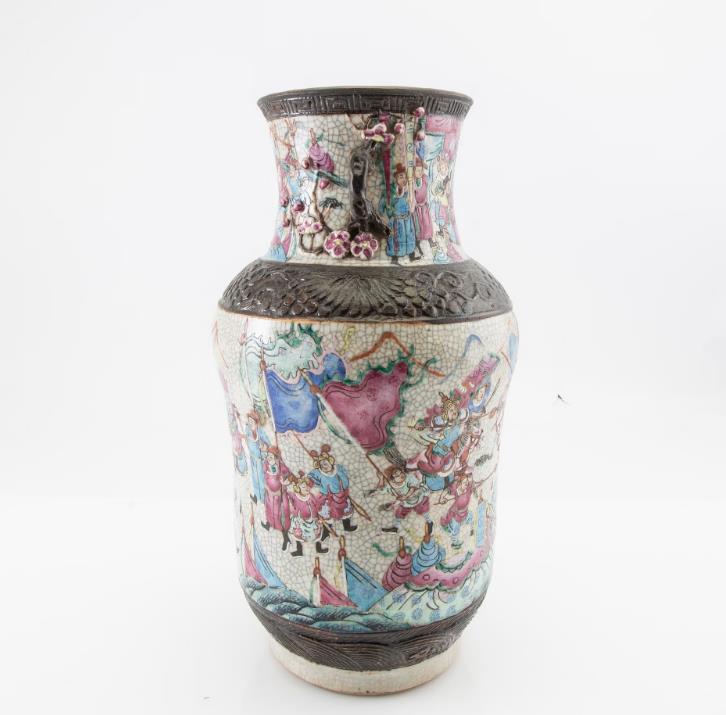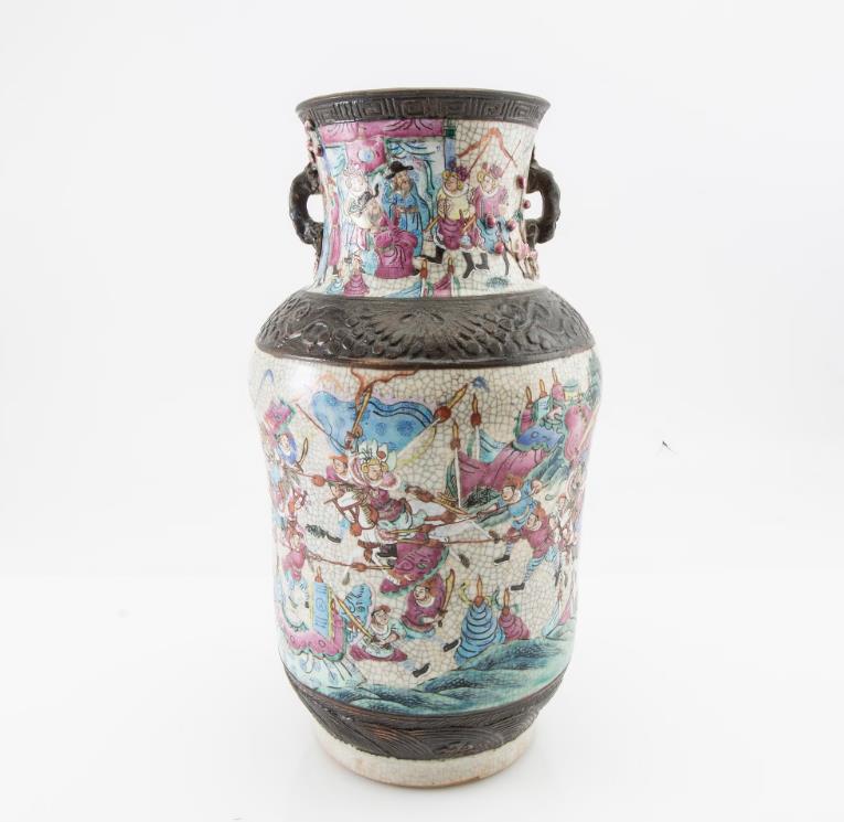 Polychrome decoration in famille rose colours of battling samurais, height approx. 36 cm Wear due to age and use.