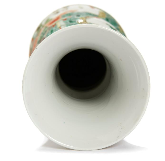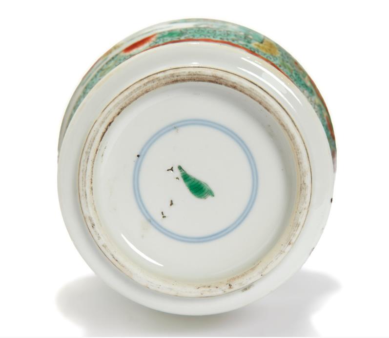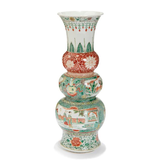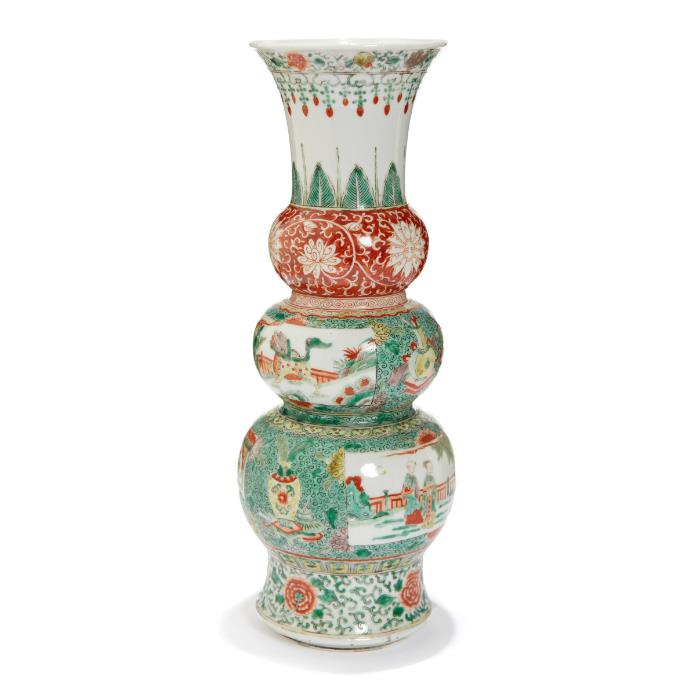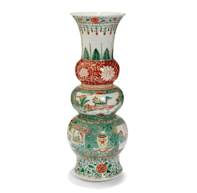 Height 34 cm Diameter 11 cm Triple spherical vase with high neck and trumpet mouth. Hand-painted décor in famille verte enamel colours in iron red, green, yellow and eggplant. Depicts floral décor, figural scenes, foo dogs and antiques. The lower part of the neck is decorated with stylized leaves. Below the bottom an artemisia leaf in green within double, subglaze blue rings. 158224-5