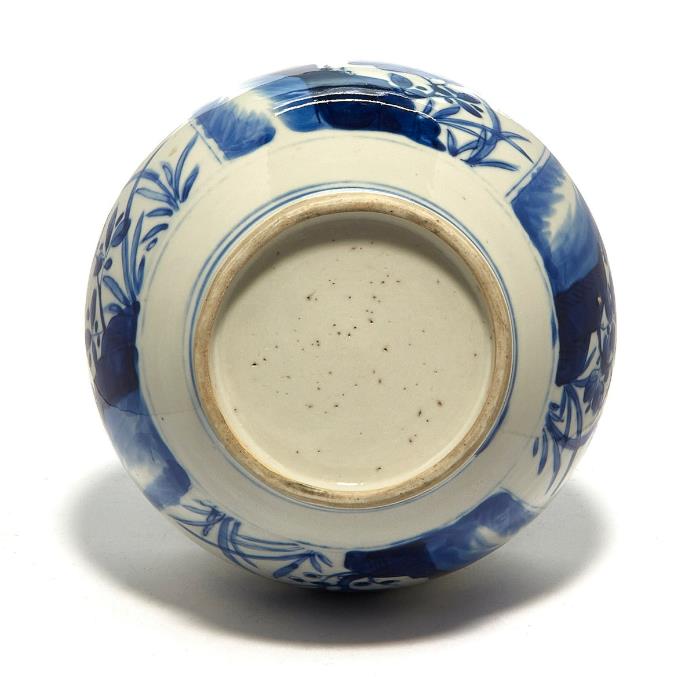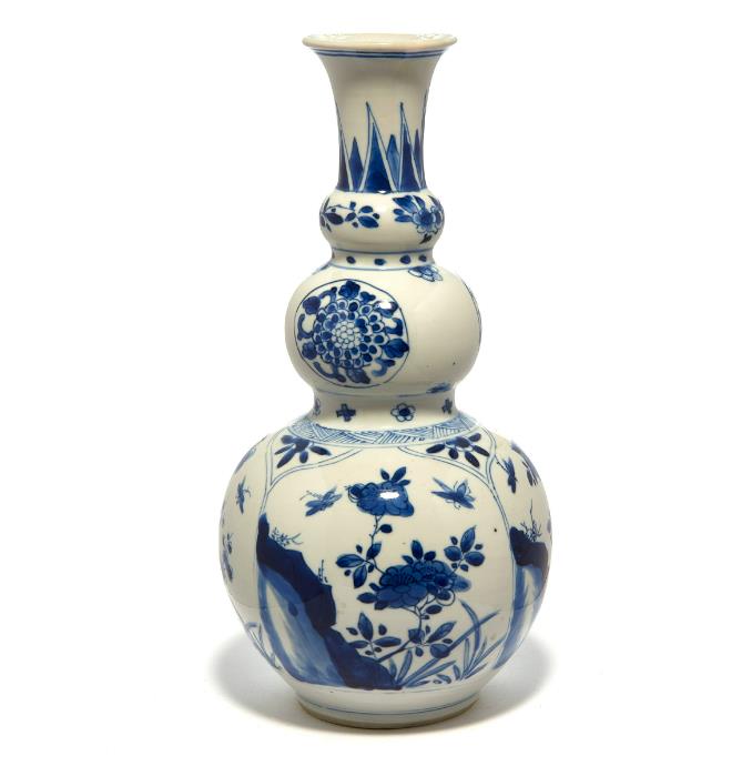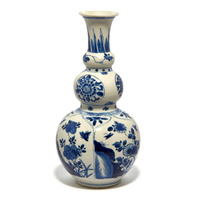 Height 28 cm Diameter 12 cm Triple spherical shape with high neck and trumpet-shaped muzzle, standing on low foot. Hand-painted décor in cobalt blue underglaze. The lower part is divided into four panels with different plant and flower motifs with butterflies. Various flowers and flower medallions on the upper spheres, and stylized leaf shapes on the high neck. Compare to lot no. 215, Bonham's London in 2015. The vase can also be compared to a similar vase with a figural motif in August den Sterke's collection with inventory number N 276. In the inventory of 1721 are catalogued six "bouteillen mit drei Bauchen" (bottles of three stomachs). Four of these are still in the collection at the Zwinger Museum in Dresden. 157825-1