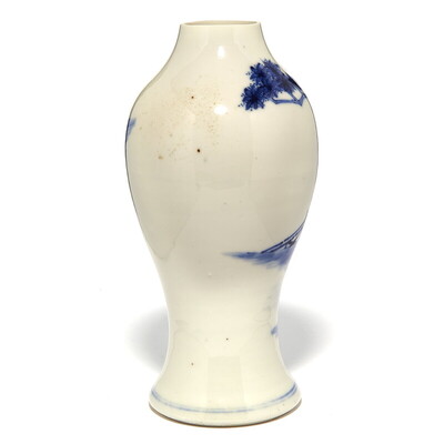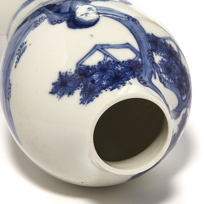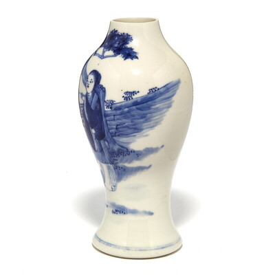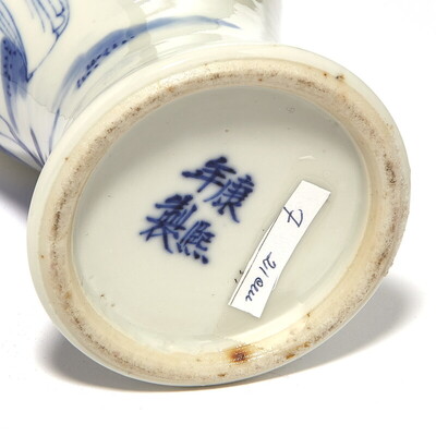 Height 22 cm Diameter 9 cm Hand-painted décor in cobalt blue underglaze. The depiction is a motif of two figures in a garden. Apocryphal four-character Kangxi badge under the bottom. Condition The top party has been relaxed. Age-related wear and tear. A small grudge at the bottom of the glaze at the foot ring.