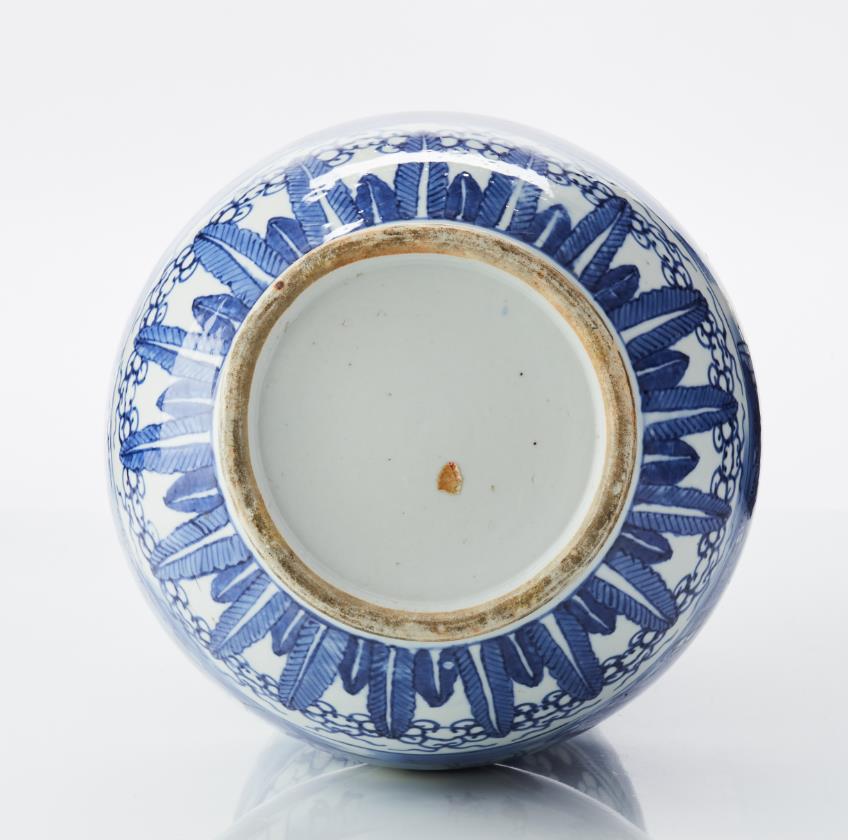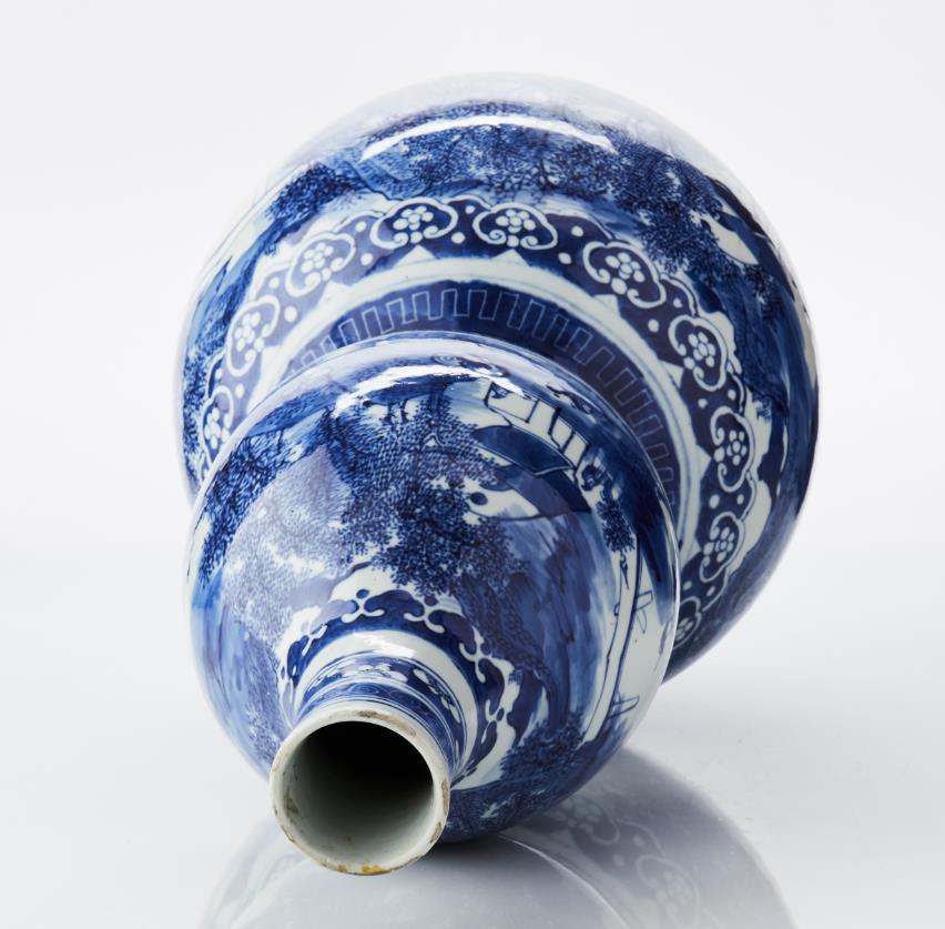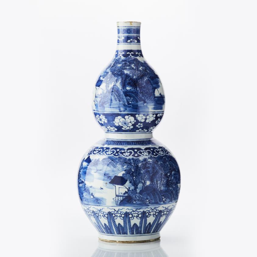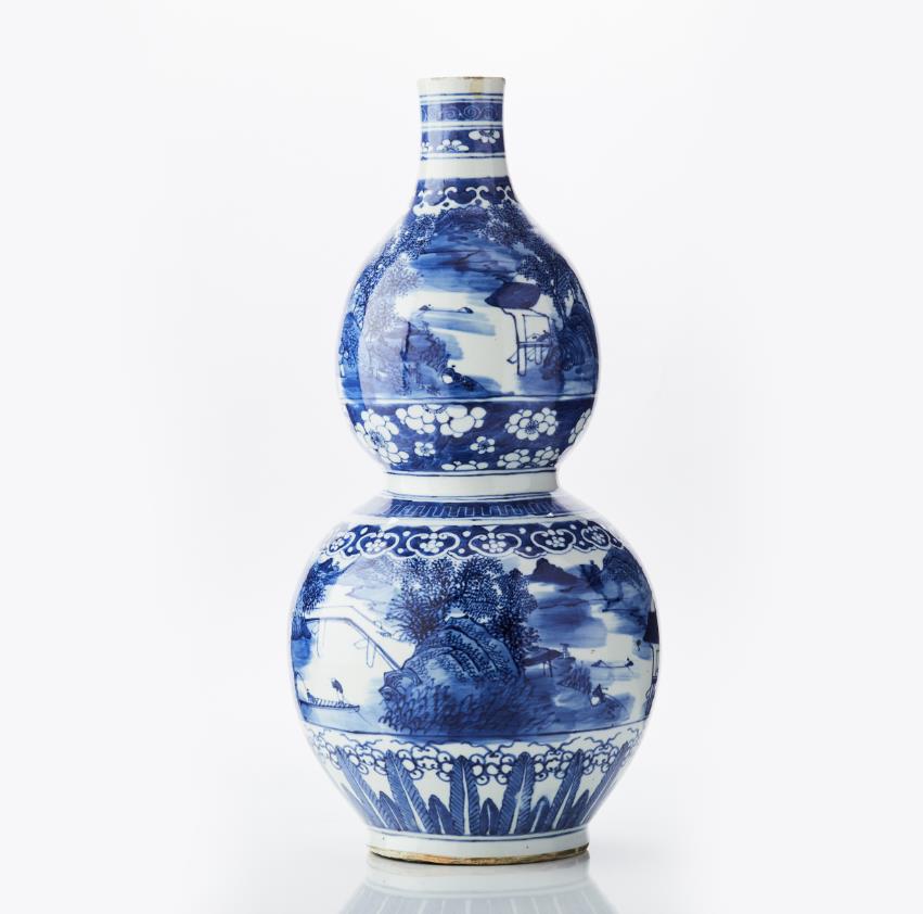 Gourd shaped. Decoration of riverscapes and borders of ruyi, cherry blossom and palm leaves in blue-and-white underglaze. H 55.5 cm. Condition report Wear. Glaze defects and chips to the rim.