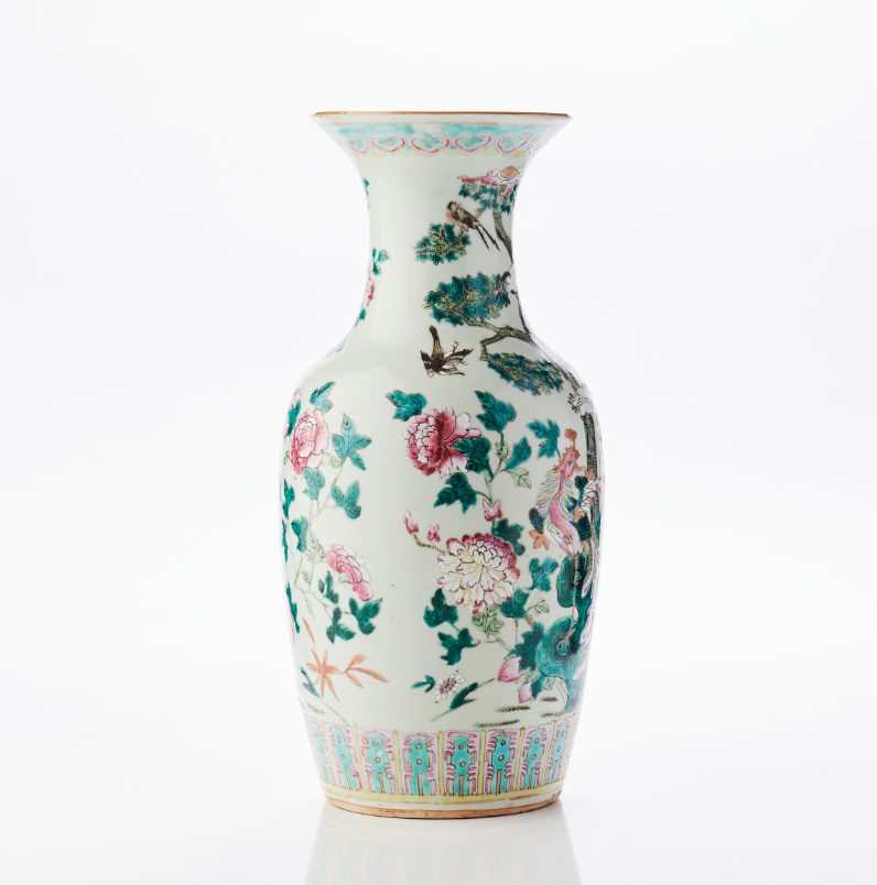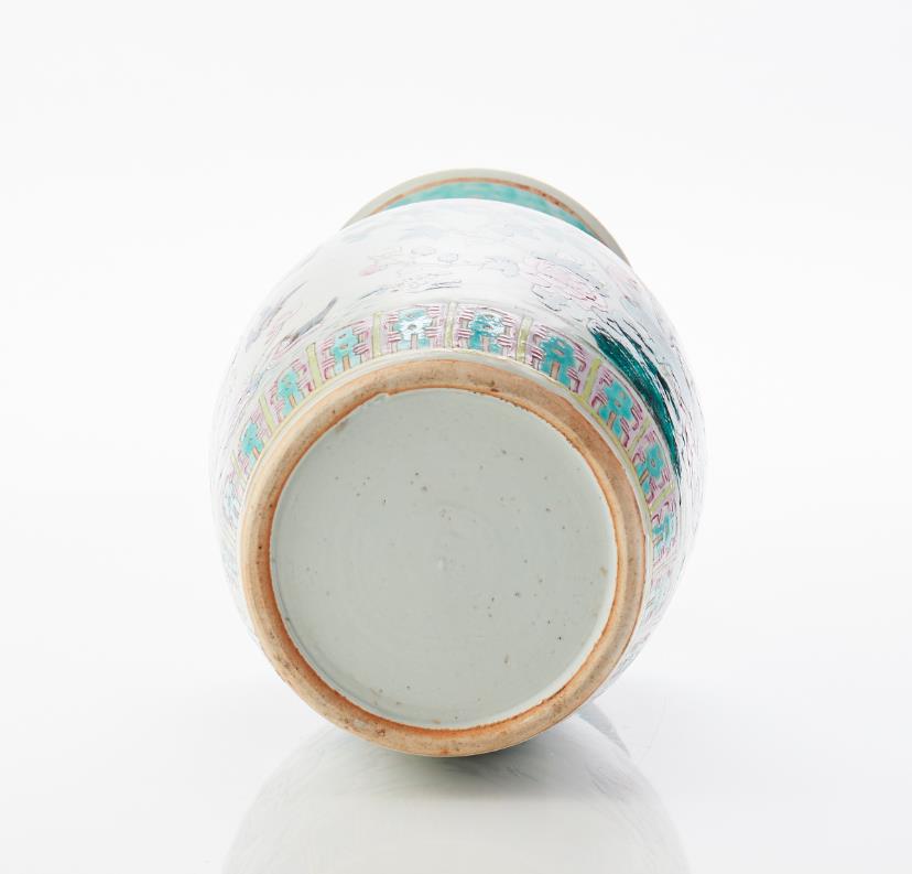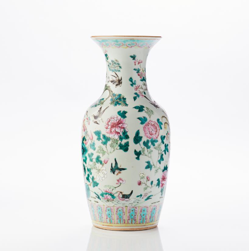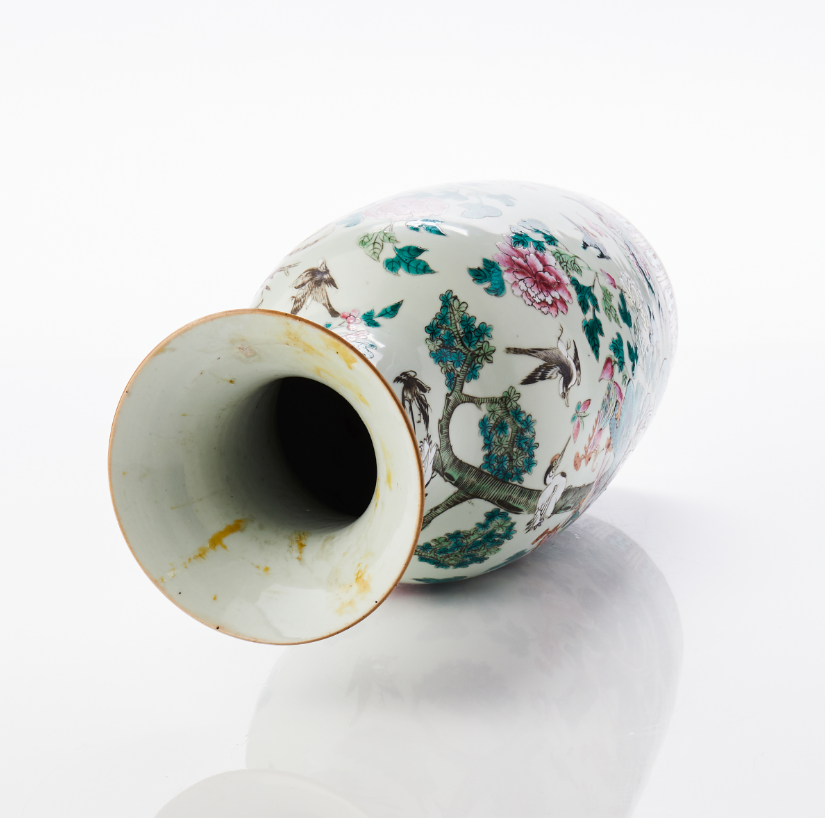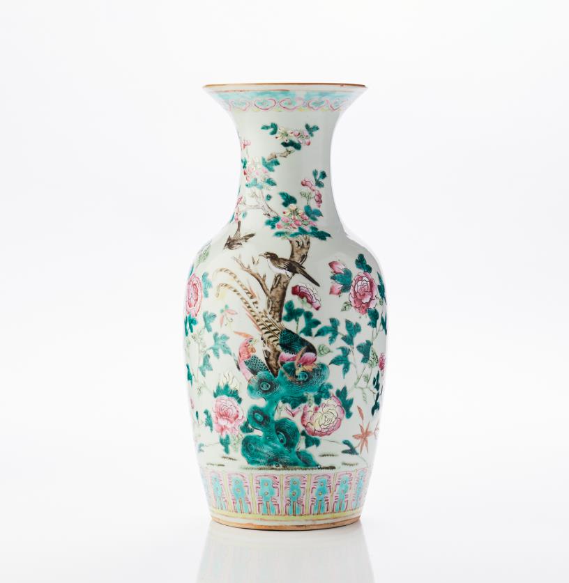 Decor of phoenix birds in garden landscape in famille rose. H 45 cm. CONDITION REPORT Internal residues of glue and surface dirt. Burning defect. 79535