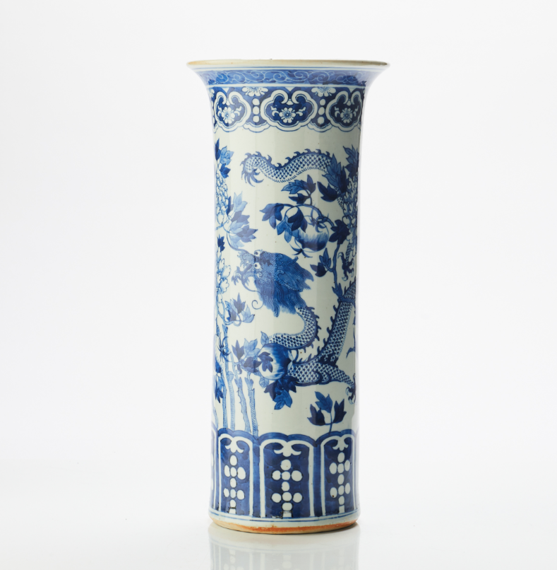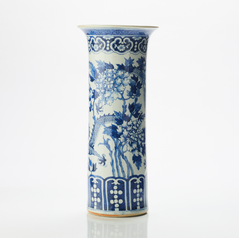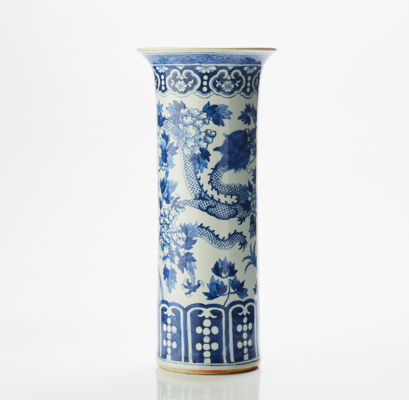 Decoration of four-clawed dragons chasing the burning pearl among peonies. H 45.5 cm. CONDITION REPORT Wear. Glaze abrasions. Larger glaze defect inside at the bottom. 502