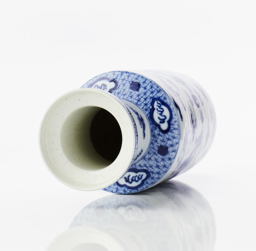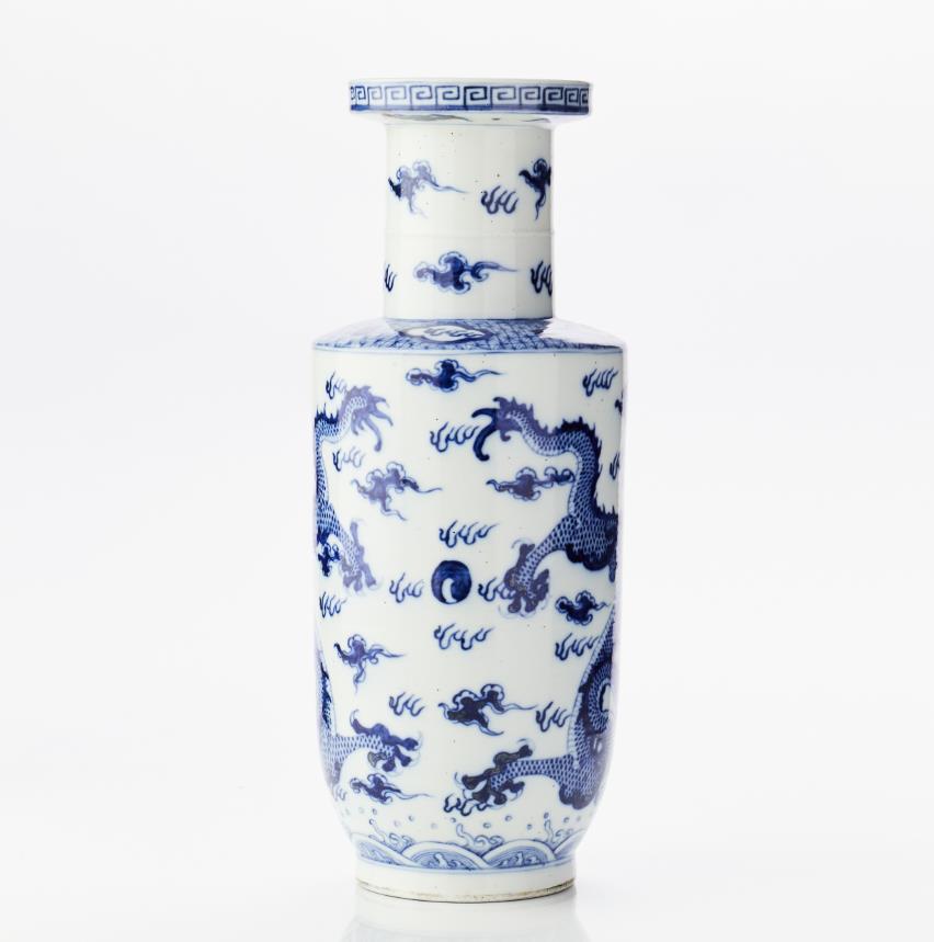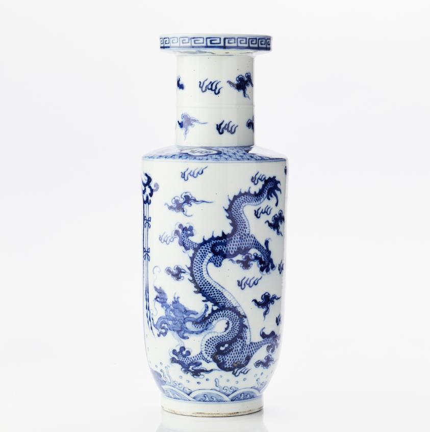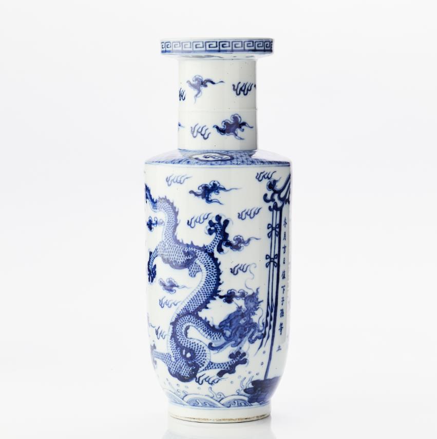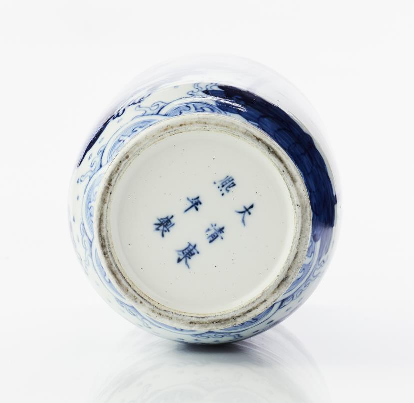 Decoration of five-clawed dragons chasing the burning pearl among clouds in blue-and-white underglaze and banner with calligraphy. Six-character badge by Kangxi. H 41 cm. Condition report Minor wear.