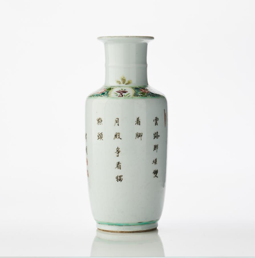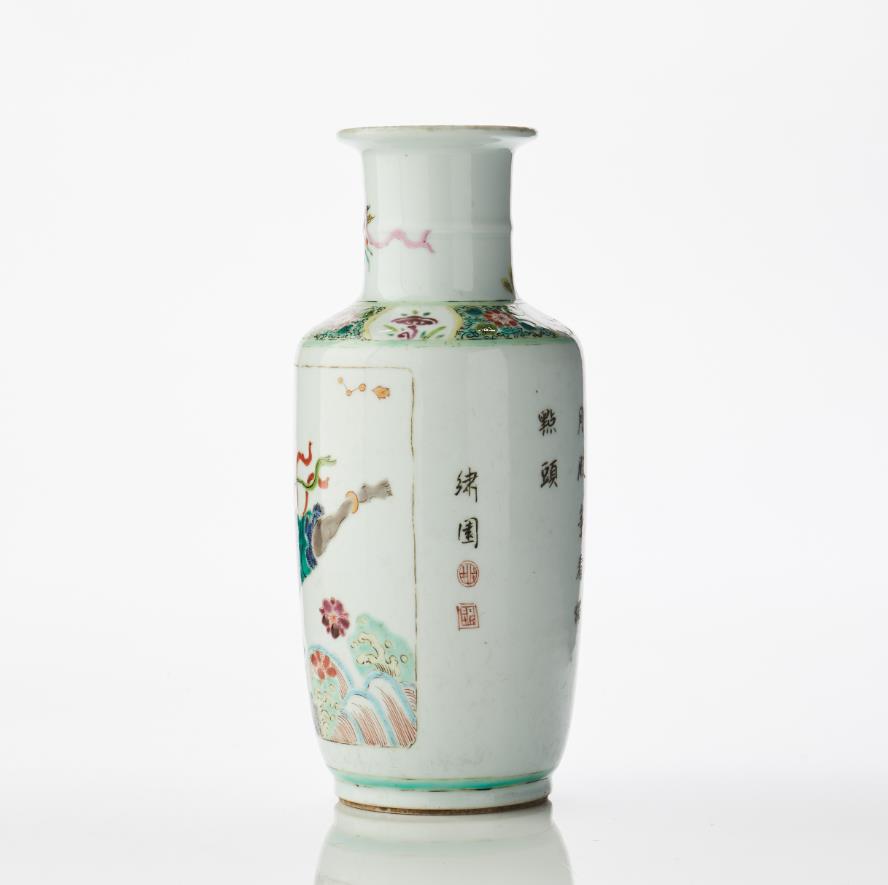 Contemporary. Rouleau shaped. Decoration by Kui Xing in polychrome enamel colors. Six-character mark of Kangxi in blue-white underglaze. H 22 cm. CONDITION REPORT Wear. Scratches. 623