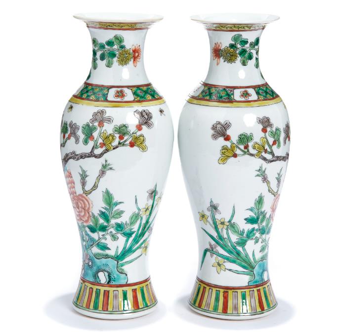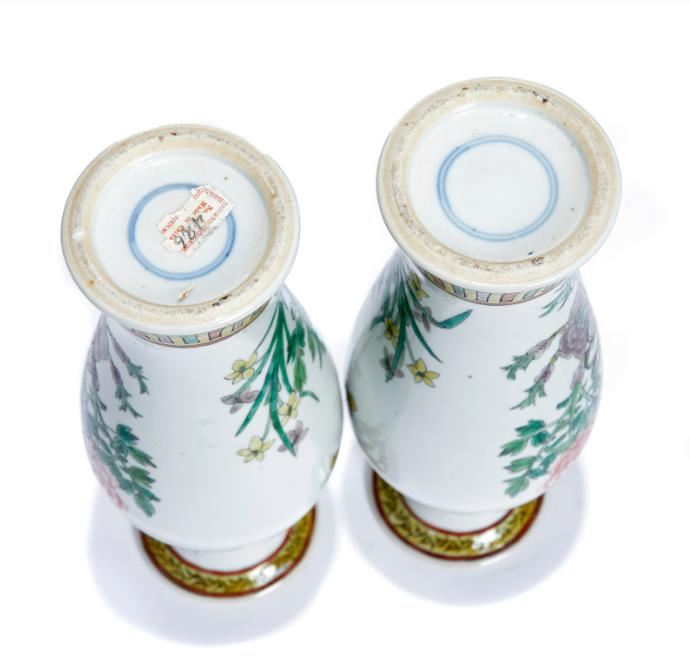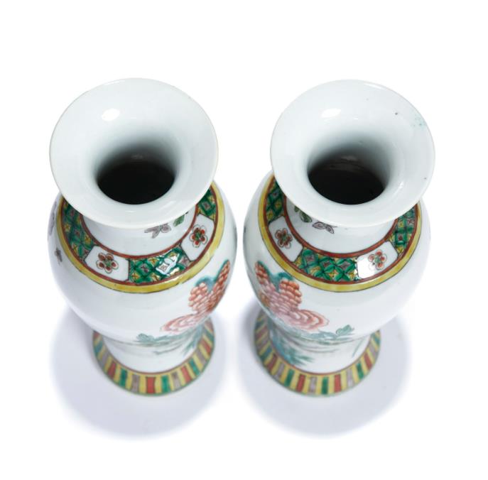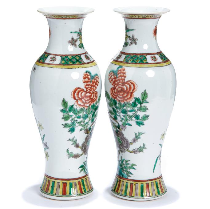 Height 30 cm A couple. Hand-painted décor in familiar verte-enamel colours. Depicts motifs of flowers and plants with birds. Double rings in cobalt blue under the bottom. Condition Age-related wear and tear. Minor irregularities, shrinkage cracks and ash/sand residues from production are not described. Hidden cracks or damage may occur on older items.