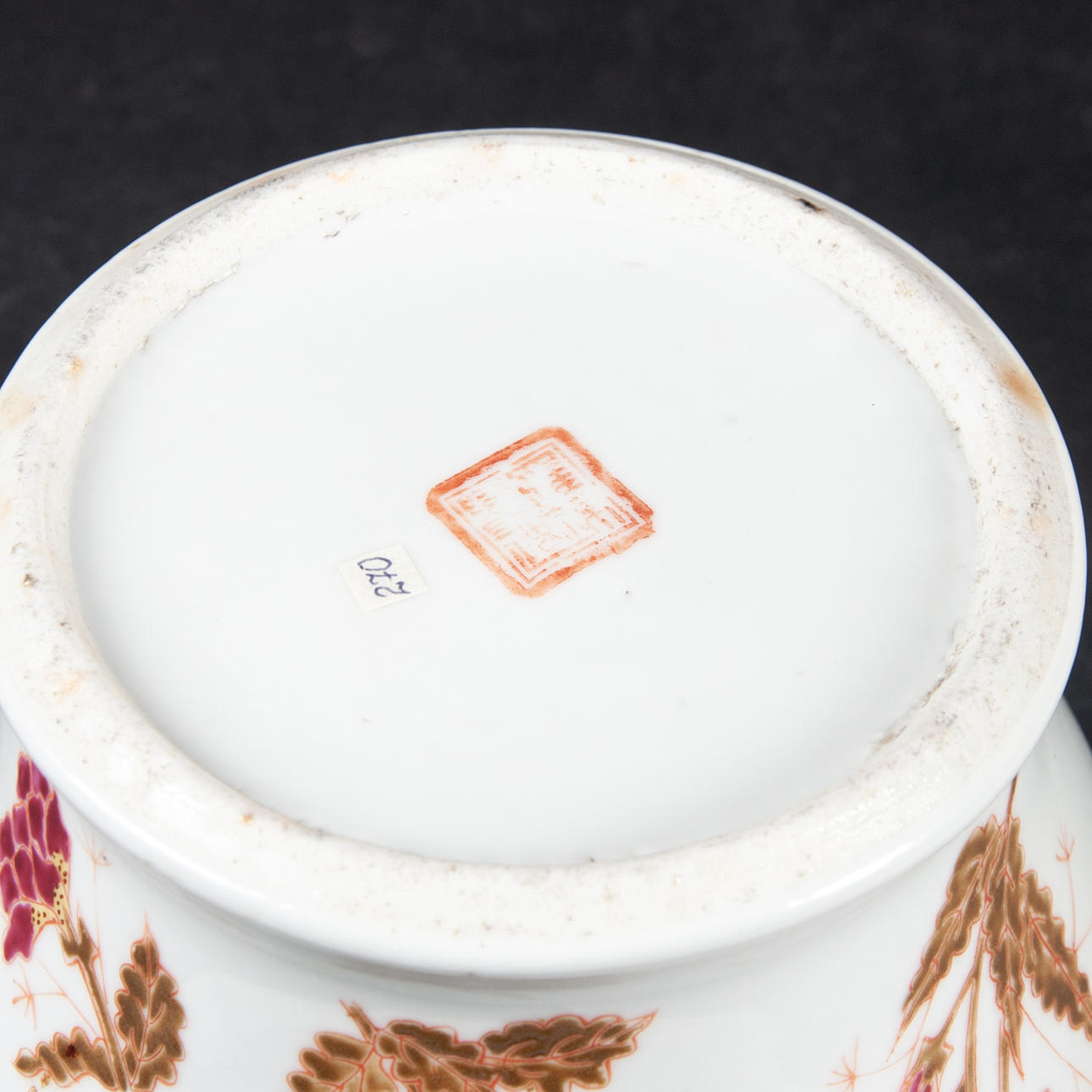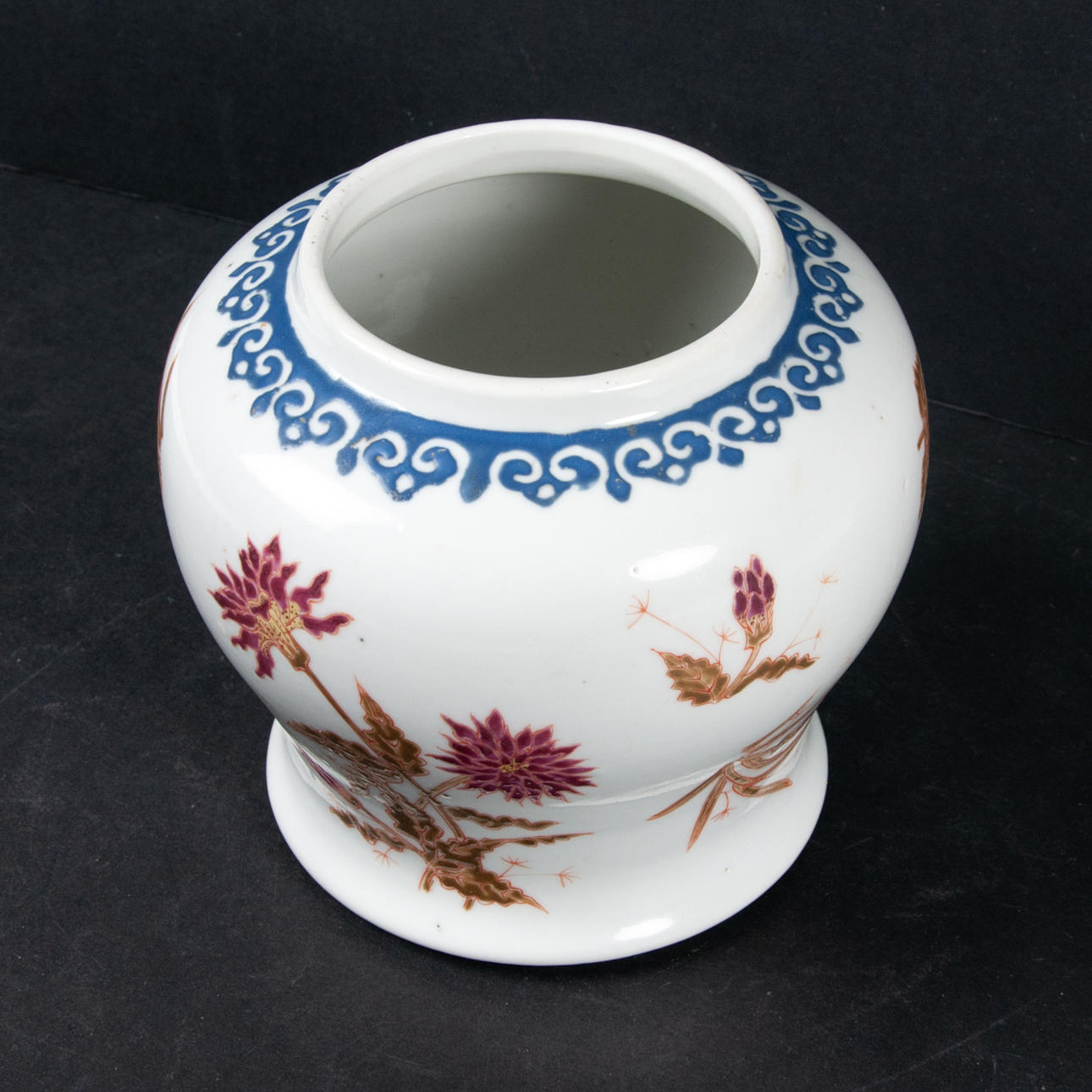 With floral decoration on a white background, blue muyi ribbon at the top height 14 cm, diameter max 15 cm. Fitness report less wear and tear. 46445