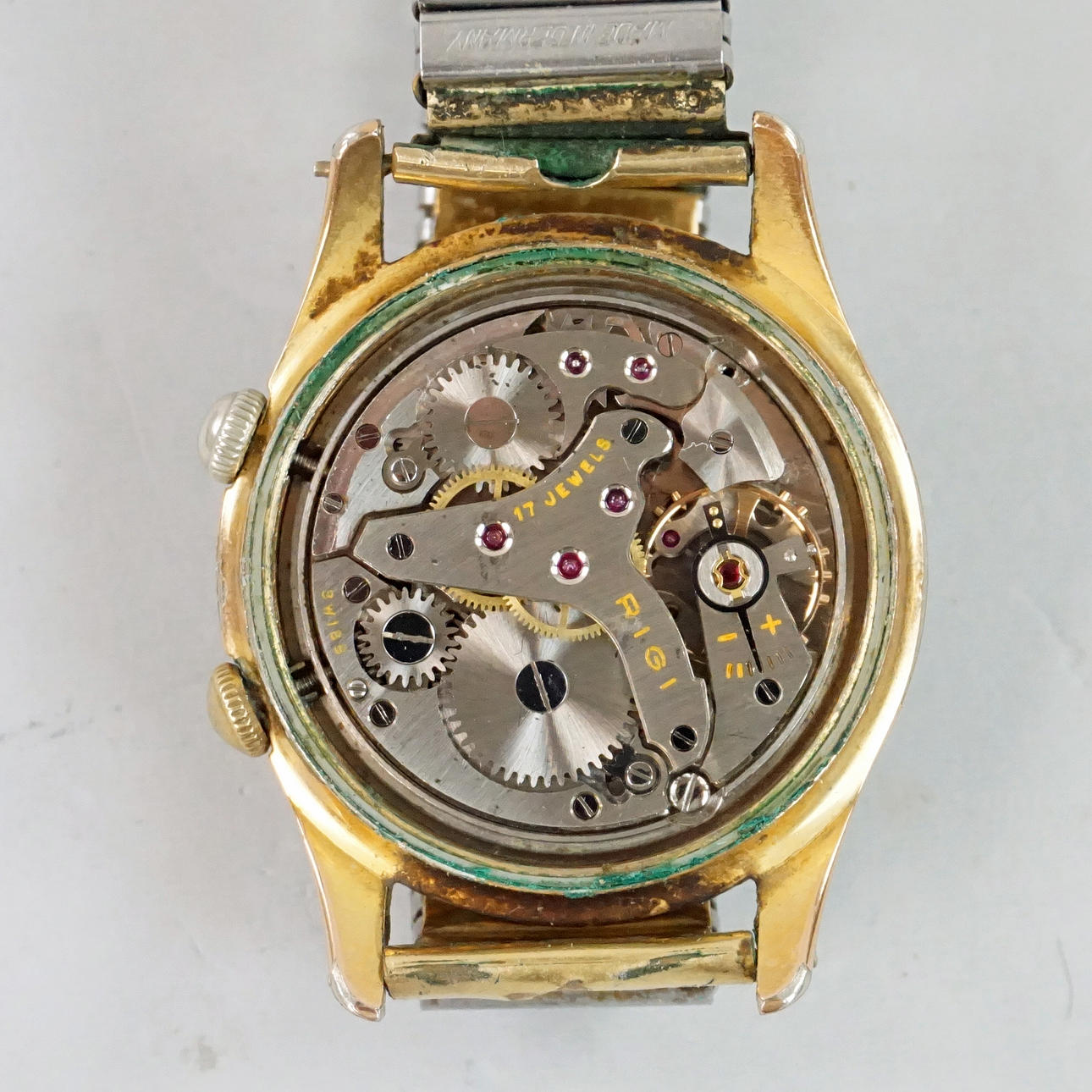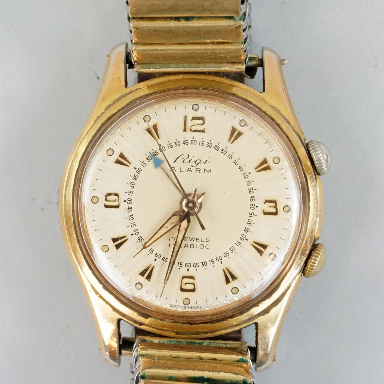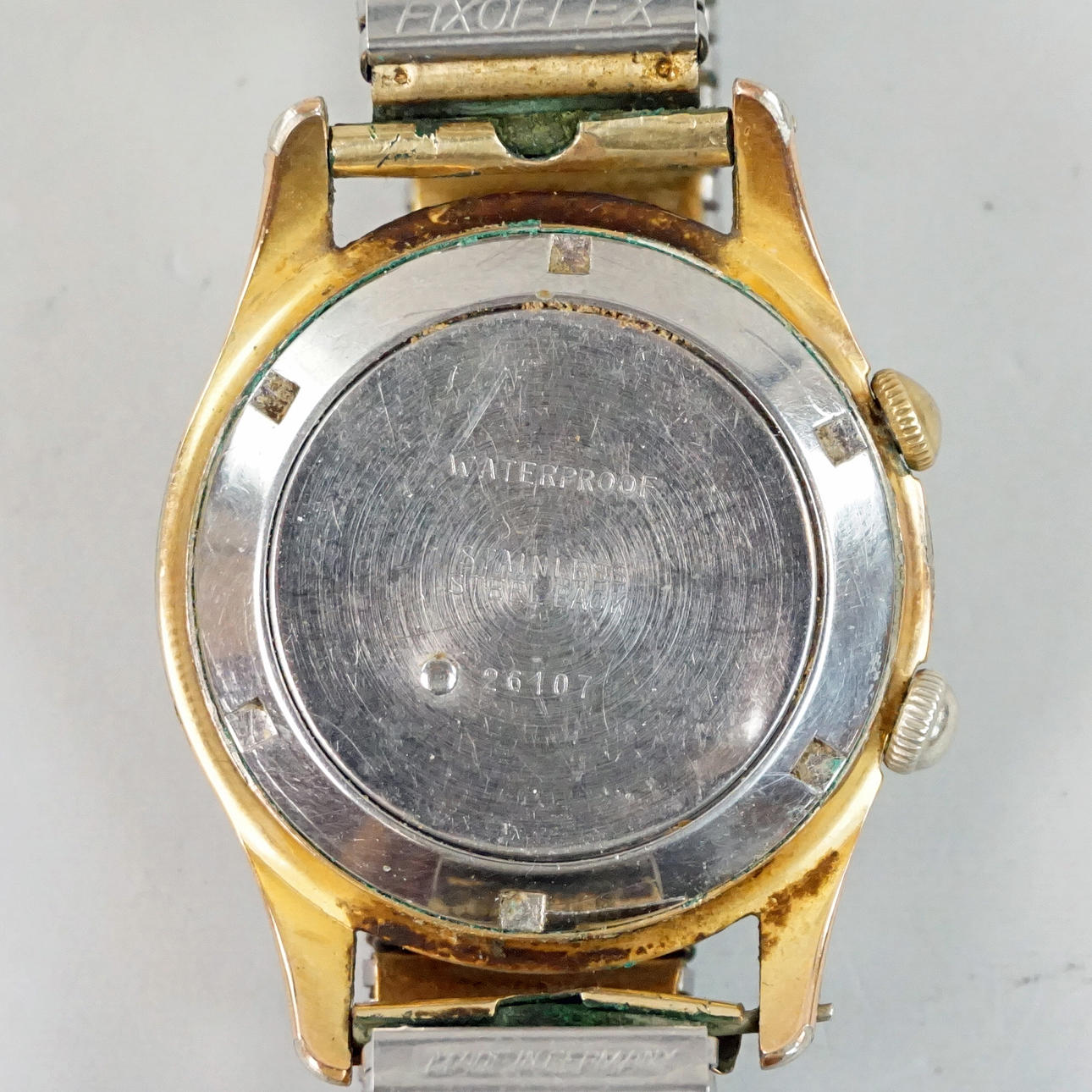 Diameter approx. 35 mm. Case marked No 26107. Bracelet Fixoflex. Condition Normal wear and tear. The clock was working at the time of cataloging. Alam not tested. No functional warranty is provided. 12904