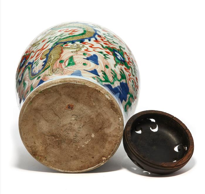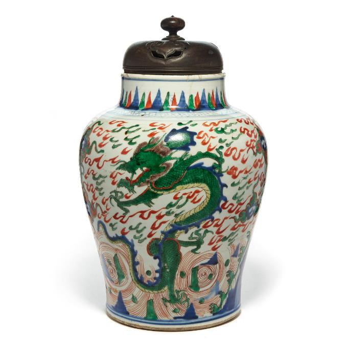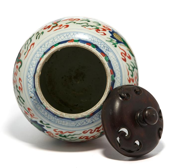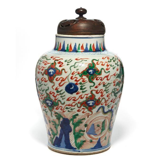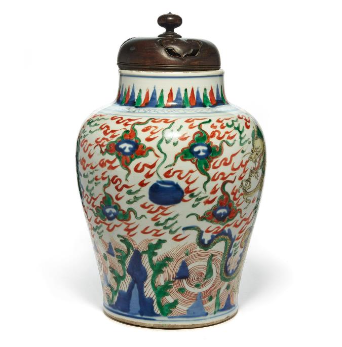 China. Transition, 1600s. Height 32 cm Baluster-shaped jar with high shoulders, and with a high neck. Hand-painted Wucai décor in cobalt blue underglaze and iron red, green, aubergine and yellow in enamel colours. Depicts motifs of two dragons, one yellow and one green, floating among clouds in search of the burning pearl. The neck is decorated with stylized foliage. With secondary wooden lid. Age-related wear and tear. Surface scratches. Strong wear on the glaze and some shallow grudges on the mouth, as well as a larger grudge. A crack from the brim (about 10 cm). Some surface marks. Abrasion and drying cracks on the lid.